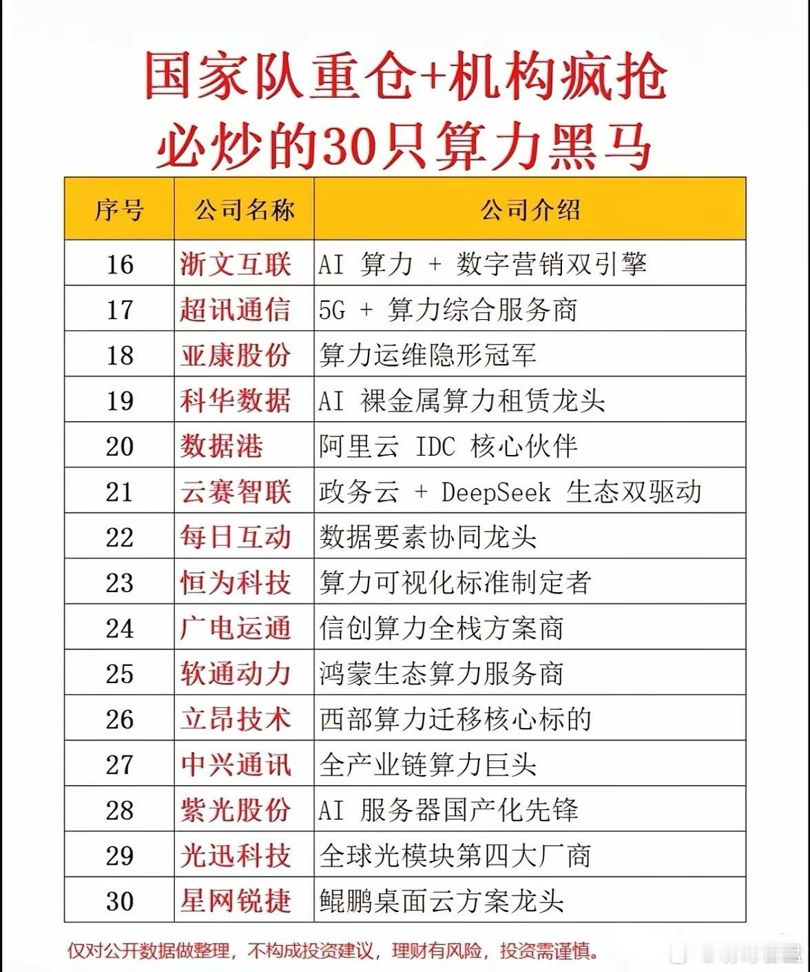国家队持仓算力核心解析:多元赛道齐头并进,核心技术驱动未来增长在数字经济与人工智能浪潮的推动下,算力产业已成为科技领域的重要基石。从当前市场布局来看,产业链可划分为多个细分板块:以华为鲲鹏、鸿蒙生态为代表的算力基础架构,以AI服务器、液冷超算为核心的硬件设施,以算力租赁、IDC服务为主的服务模式,以及光模块、运维服务等关键支撑环节。这些细分领域共同构成了层次分明、协同发展的算力生态体系。市场情绪方面,算力概念持续受到资本高度关注。机构资金与国家队的深度布局,反映出对产业长期价值的认可。尤其在国产替代、绿色转型、跨界融合等政策导向下,算力与5G、政务云、数字营销等领域的结合不断深化,形成多轮驱动的发展格局。从发展潜力看,随着AI应用普及、数据要素市场化进程加速,算力需求将进入爆发式增长阶段。超算技术升级、低碳数据中心建设、算网融合创新等领域,有望成为未来竞争的高地。预计产业将保持高景气度,具备核心技术与生态协同能力的企业更具成长弹性。未来走势上,算力产业将呈现“技术多元化、服务精细化、生态开放化”特征。在自主可控与全球竞争双重要求下,产业链各环节将持续优化与整合。投资者应关注技术迭代风险与市场波动,理性把握产业趋势,从基本面出发挖掘长期价值。