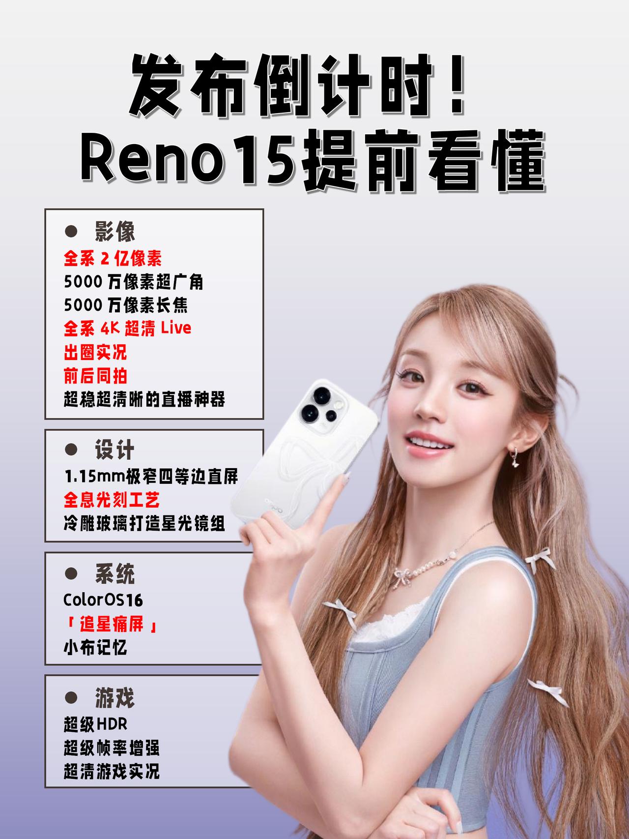 这不得卖爆!OPPO Reno15爆料汇总! 前几天宋雨琦的地广和OPPO Reno15系列各种影像功能和卖点都被曝光了, 各种装扮的雨琦非常美,而且手机很好看,大R角、窄边框、星光蝴蝶结、铝合金中框等,两三千的oppo质感媲美iPhone? ✨首先是拍照,Reno15全系升级2亿像素主摄, 实况玩法也有大升级,包括最近很火的出圈实况,iPhone17现在都没有 一拍二拼三出圈,直接生成超好玩的实况Live,就是这么简单! 还有苹果同款前后同拍,4K Live,Pro款还是超稳超清晰的直播神器 相机这块,Reno15属实是拿捏住了 四颗摄像头没一个凑数的 除了后置主摄2亿像素,超广角和潜望长焦都有5000万像素 前置摄像头都有5000万,而且还是100度超广角和Pocket3一样的画幅! ✨外观 Reno15升的星光蝴蝶结设计超美,蓝色那款也不错,而棕色好像还吸引了不少男生hh 正面还有1.15mm极窄边框四等边直屏。 ✨日常使用的话也不用担心 Reno15配合ColorOS16主打一手丝滑体验 续航也有6200mAh(Pro是6500mAh)大电池兜底,告别续航焦虑 玩游戏也有超级帧率增强功能,跑图团战一路稳定 第五人格还能开120帧,加上超级HDR,游戏沉浸感直接拉满! ✨ColorOS 16有很多实用功能 例如AI小布闪记,能轻松AI记录账单、AI取餐码~ 还有全新升级的动态景深壁纸,把偶像设为壁纸简直就是追星痛屏 把宋雨琦做成动态壁纸,开屏就是美美哒~ 整体看下来OPPO Reno15系列升级还挺多,加上供应链涨价的话,价格估计会在三千块?