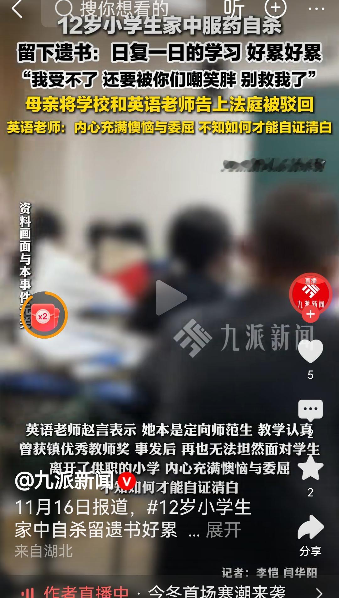 双输 一个12岁女孩服药自尽,留下遗书里写着:写不会的英语单词 ,一次不写作业就被叫到办公室等等 其母认为是英语老师的问题。将老师告上法庭 。 虽然最终法院驳回了诉讼请求。 可英语老师觉得也挺冤枉的啊,又没有单独叫她一个人,不知道怎么自证清白,内心充满委屈。被迫离职。 这件事情 女孩失去了生命,老师失去了工作。 其实现在父母和学校都只是要求分数,成绩,而不去关注孩子们的心理问题,以至于孩子们遇到挫折就容易走极端。