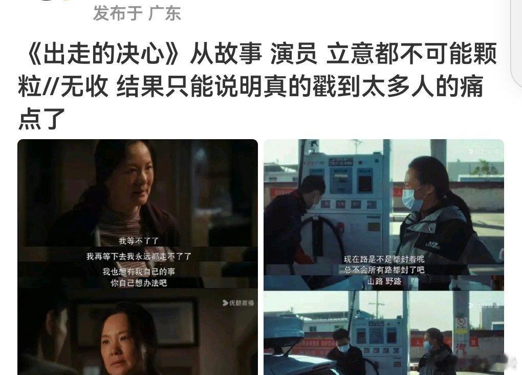 《出走的决心》很多都能踩但是就是踩不了好东西好东西从营销 演员 立意,基本是拿着女性电影、女权贴脸上的,基本全面“谢绝”男性观众了能拿到5亿的女一番票房,比很多男一番故事片难度大太多金鸡不看票房才是笑话好吧,张小斐的影后陈思诚的导演,不看票房怎么来的? 只是看不看、怎么看,看金鸡的心情了,所以哪吒不鸟他们