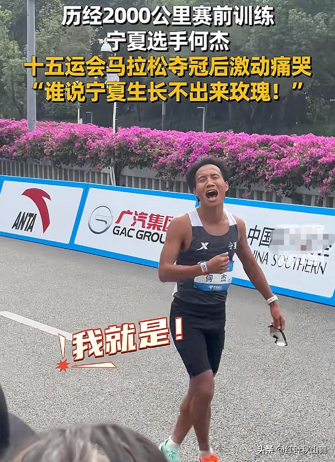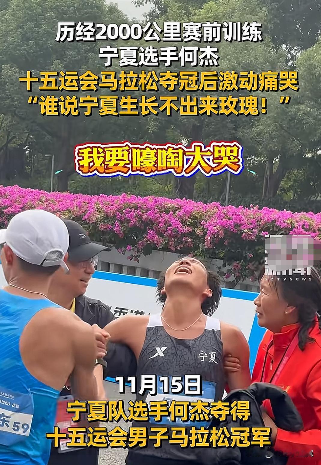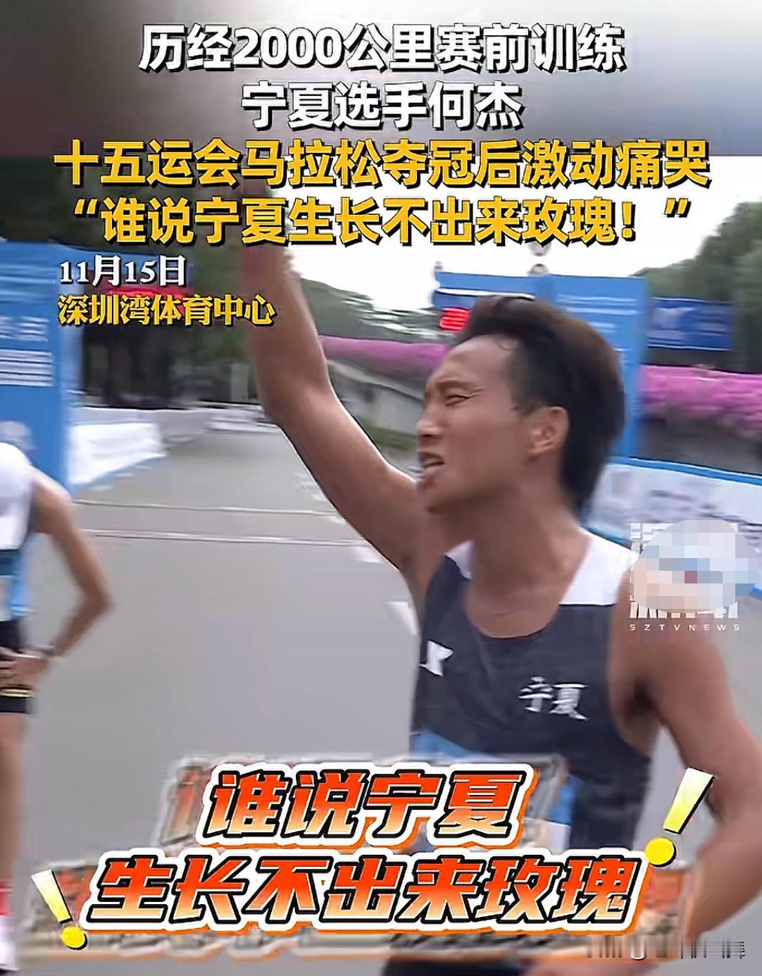 谁说宁夏长不出来玫瑰?我就是!这是宁夏马拉松选手何杰第一个冲过终点时,边痛哭失声边高声喊出来的话。作为体育大省的人,可能很难理解何杰当时的心情以及那种看上去太过于煽情和激动的话。他们不知道宁夏人民等这块金牌,已经等了足足38年!上次夺得全运会金牌,还是1987年第六届全运会摔跤项目上夺得的。而为了这枚金牌,用何杰教练的话来说,“他的成功是拼搏换来的!在肯尼亚外训期间,训练到吐是经常的事。”有宁夏网友说何杰经常在宁夏追着骆驼跑,这个画面听上去有种浪漫唯美的感觉,但只有何杰的教练和他本人,才知道这里面有多少的艰辛和痛苦。所以在面对上去安慰他的教练和工作人员时,他留着泪说不要拦着我,我要嚎啕大哭!“谁说宁夏长不出玫瑰?”这既是他自豪的宣言,也是对宁夏本地体育事业的激励。相信他的夺冠的画面和他的这些话语,会在宁夏反复的播放、传播。其中一定有些孩子会受到他的影响,以更大的热情和决心投入到体育事业中去。相信以后宁夏会长出更多更艳的玫瑰。祝贺何杰!祝贺宁夏!
