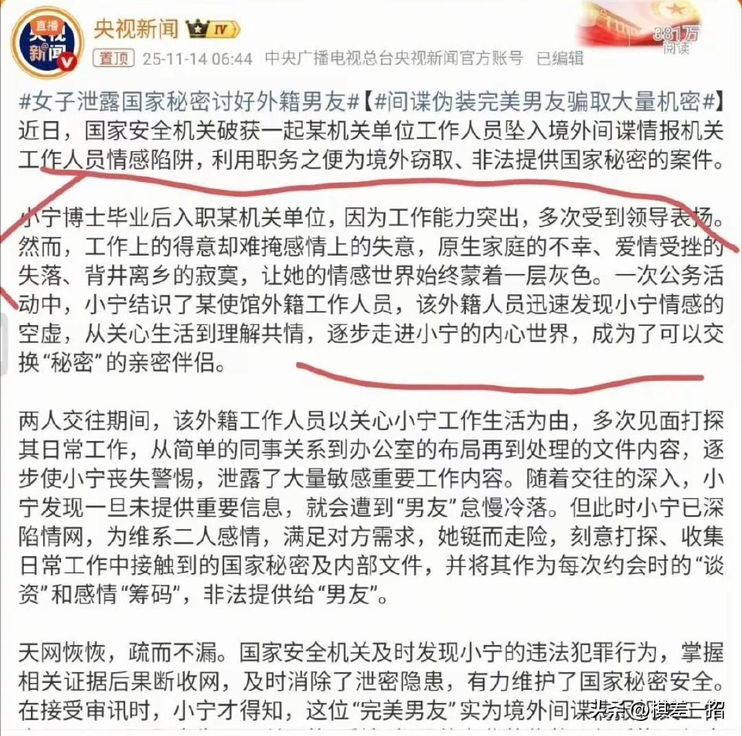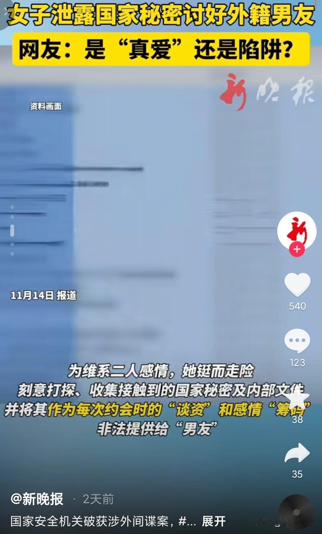 为了一个外国男友, 泄露国家秘密讨好他。 她本人因为感情受挫、原生家庭不好,外国男人体贴会说话,在生活中有意无意的跟她聊起她的工作以及机密性问题。 之后更是撺掇你盗取国家机密,你不可能不知道这个的重要性,这也太傻了,你自己获得了什么,人家已婚在国外,你现在自己是主犯,要承担一切后果,还要贴上卖国贼的标签。 你的领导也会因你受到牵连,轻则警告、记过、降级,重则直接开除党籍。 家里人听到自己的女儿卖国,脸上也没有光。