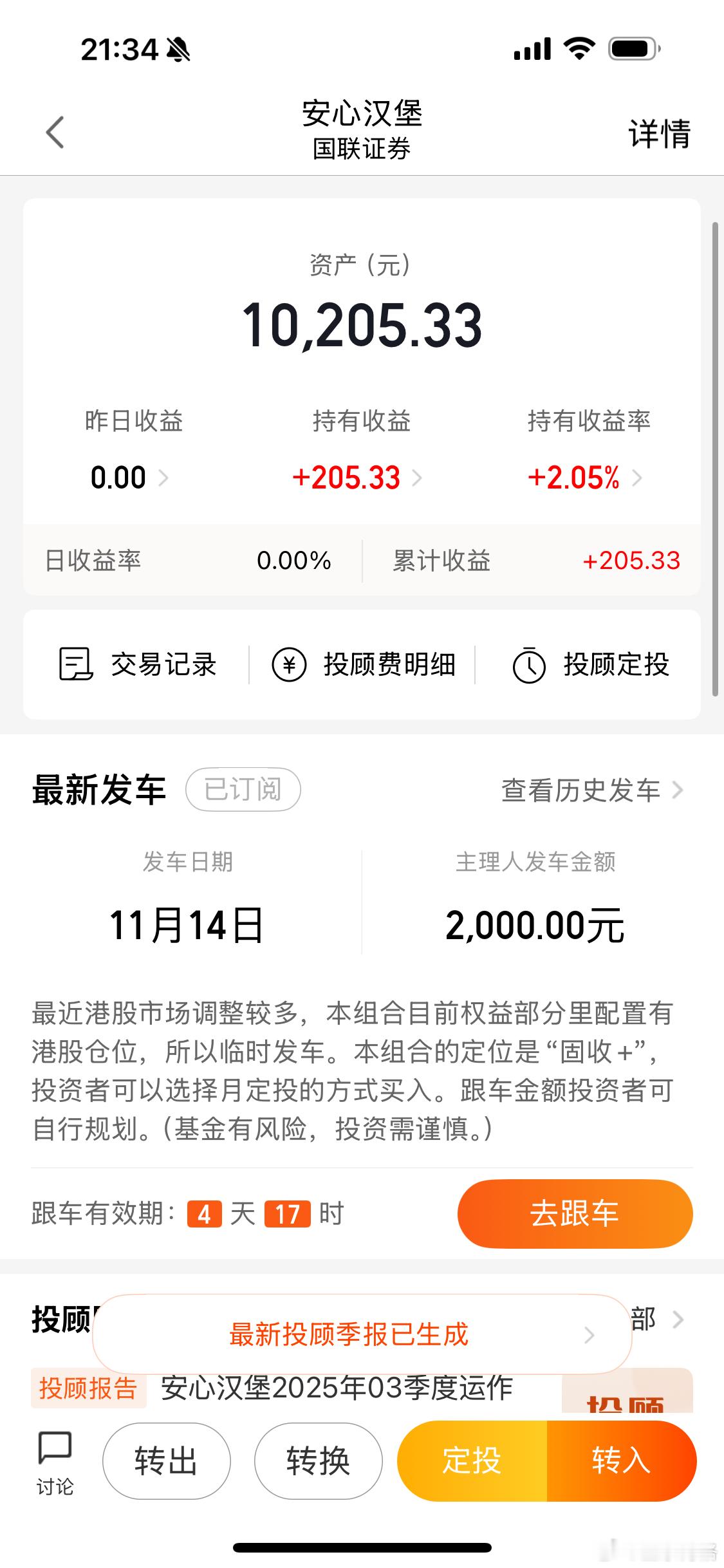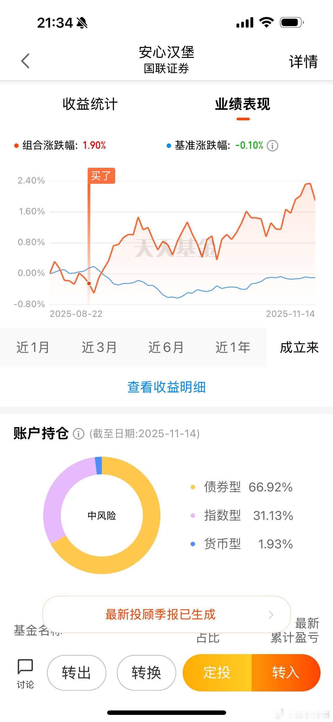 在天天基金买的安心汉堡稳稳的赚了2%了