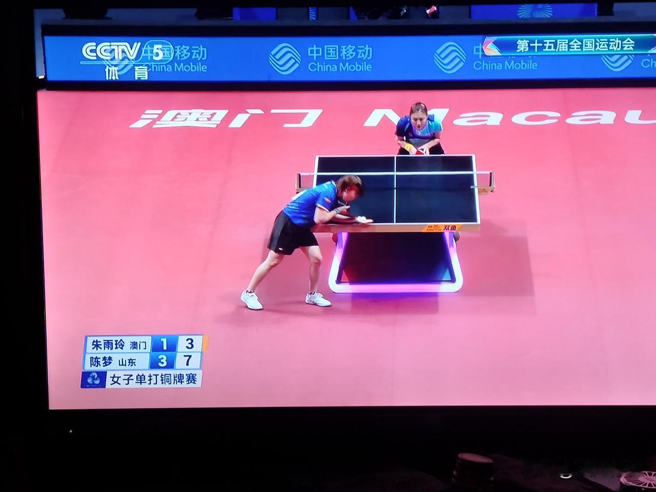 第15届全运会乒乓球女子单打铜牌赛前四局山东队陈梦3:1领先澳门队朱雨玲,第5局现在已经7:3领先,不出意外,陈梦将为山东队再添一枚铜牌。陈梦脖子上的大金链子很是显眼,这个大金链子值5万块吧? 现在山东队和广东队金牌数相差不多,山东队全运会金牌5连冠还是有希望的吧?