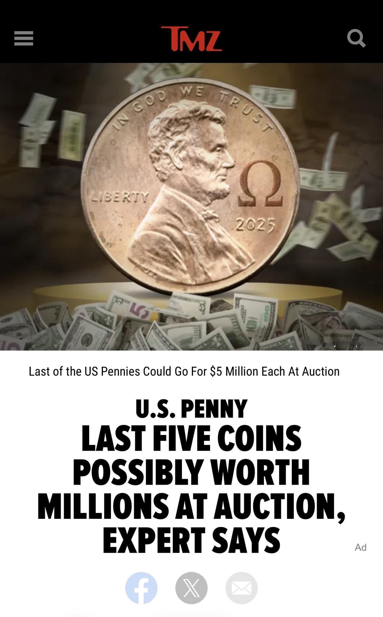 美国本周铸造了最后一枚美分......根据一份新报告,专家现在表示,这些硬币在下个月拍卖时可能价值数百万美元。 如你所知,经过232年的流通,最后一枚1美分硬币于周三在费城铸造。 据《今日美国》报道,12月,这些便士将被拍卖,最后铸造的5枚硬币每枚可以以高达500万美元的价格出售,因为它们包含一个反映其特殊地位的欧米茄符号。 罕见的硬币专家John Feigenbaum告诉媒体......“收藏家们会为现代罕见的商业罢工林肯美分而疯狂。”因此,Feigenbaum将5个特殊硬币中每个硬币的价值放在200万到500万美元之间。