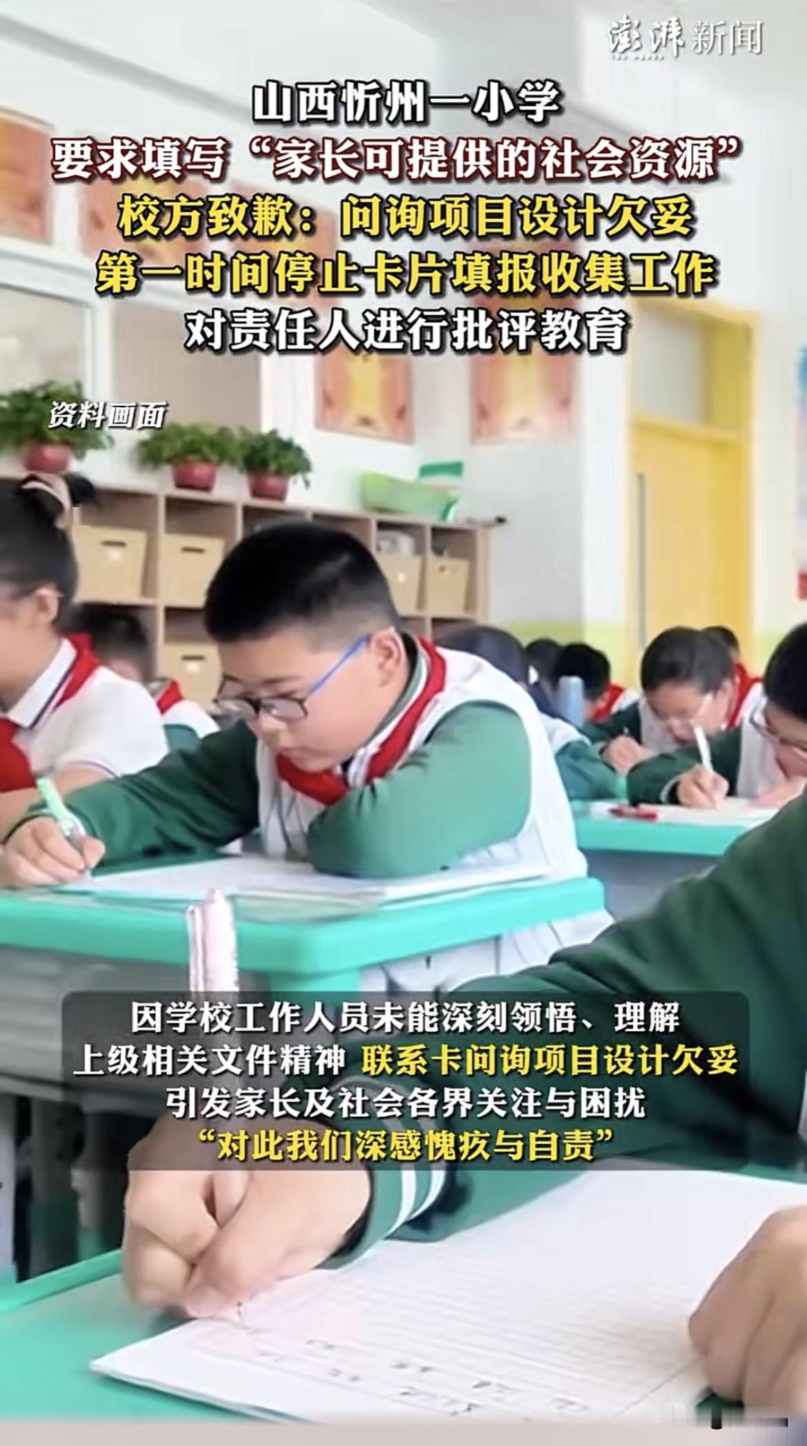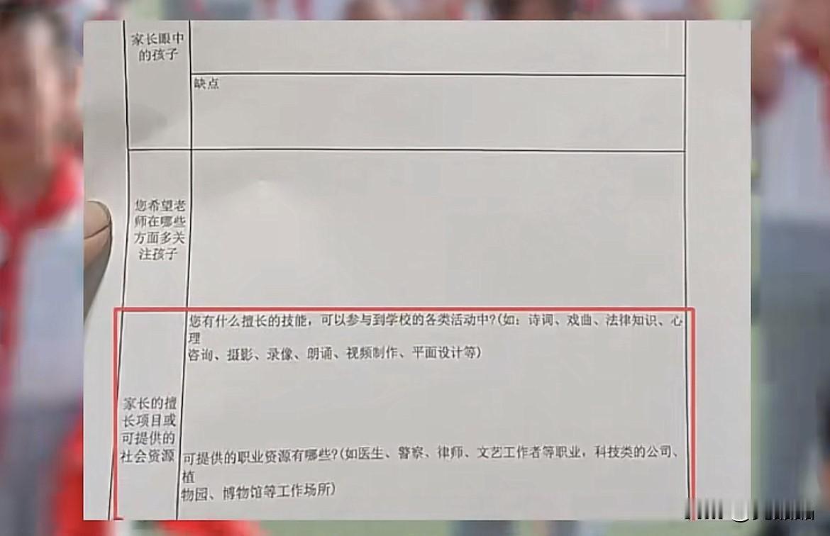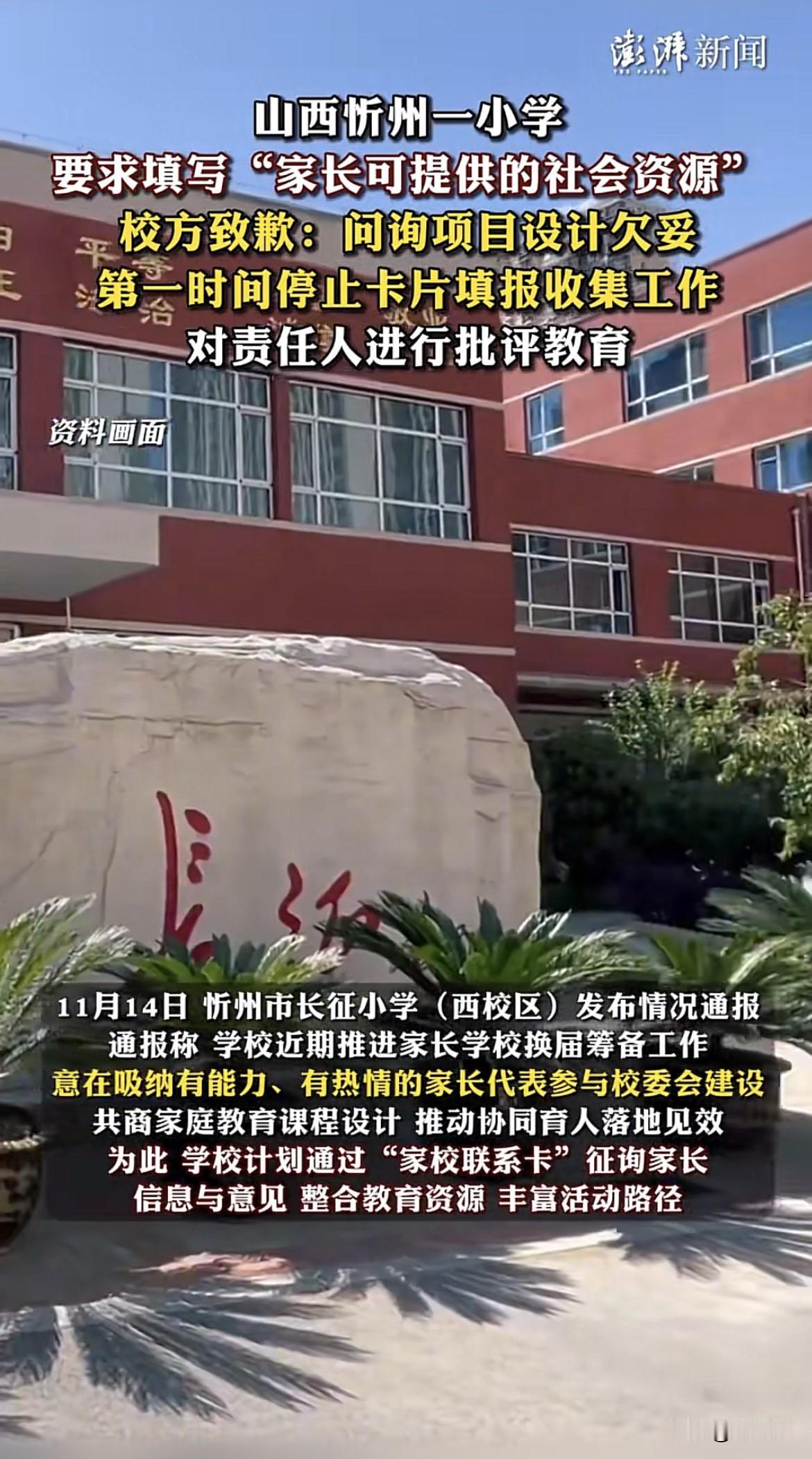 山西一学校要求填写“家长可提供的社会资源”意欲何为?此事一曝光,校方致歉,第一时间停收卡片收集信息。 从职场卷进了校园,家长估计没想到小孩读个书,也要内卷家长的职场资源、社会资源。理解学校吸纳有能力、有热情的家长参与校委会建设,但能力一般却也想积极参与的家长就没资格参与进来了吗? 恰恰相反,越是普通的家庭对孩子寄予更大的厚望,家长知道自己能力一般,就越希望孩子通过读书有更好的发展,这类家长更想参与到孩子的教育中,学校不该以可提供的社会资源,对家长贴标签,阻止每位家长公平参与到孩子的学习中来。 教育公平不能掺杂家长能力、社会资源等,一旦掺杂,难免出现老师偏向某某局长儿子、某某总裁女儿的乱象,教育圈越纯粹越好,若是学生们拼爹拼妈,让没背景的学生情何以堪? 图源:澎湃新闻