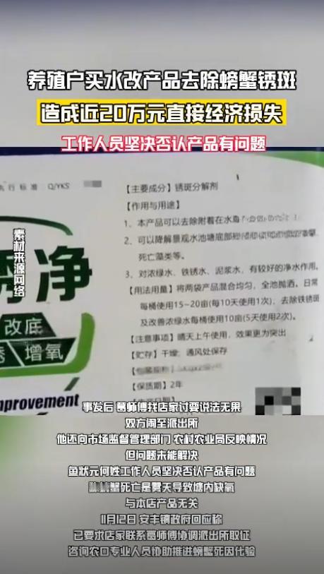 “严查到底!”江苏泰州,一男子为了去除螃蟹黑底板、锈斑,卖个好价钱,就买了2桶药倒入塘中,两天后,他又倒了2桶,结果螃蟹却开始大量死亡,损失接近20万元!男子找店家讨要说法,对方却表示产品没有问题。网友:拿去化验下就知道了! 据新余发布11月14日报道,养过螃蟹的人都知道,螃蟹这东西,要是水质不好,或者养殖密度大了,身上就容易长些黑乎乎的“锈斑”,肚子底下也容易变黑,这就是所谓的“黑底板”。 这种螃蟹,品相不好,拿到市场上去卖,价格肯定要比那些干干净净的差一大截,葛师傅就是遇到了这个难题,心里着急啊,毕竟这都是钱。 为了能让自己的螃蟹卖个好价钱,葛师傅就去当地一家卖水产药的店里想办法,店家给他推荐了一款药,说这个药效果好,专门就是用来给螃蟹“洗澡”的,能去掉锈斑和黑底,让螃蟹变得干净漂亮。 葛师傅一听,觉得找到了救星,就买了2桶回来,按照店家的说法,他把药兑好水,倒进了其中一个蟹塘里。 过了两天,他看效果好像不明显,心一横,又去买了2桶,再次倒进了同一个塘里,他当时心里想的,估计就是这下螃蟹该变干净了吧,今年肯定能卖个好价钱,过个肥年。 可他万万没想到,等来的不是白白净净的螃蟹,而是成片成片的死蟹,第一次发现不对劲,是几天后的一个早上。 葛师傅像往常一样去巡塘,走到岸边就看见水面上漂着十几只死螃蟹,一开始他还没太当回事,养殖嘛,有点损耗也正常,就把死蟹捞出来扔了。 可到了下午,情况就不对了,死蟹一下子变成了几十斤,一捞一大片,然而,真正的噩梦是在第二天早上。 他再去蟹塘看,整个人都傻眼了,水面上白花花一片,全是翻着肚皮的死螃蟹,捞都捞不过来,他粗略一算,死了上千斤,按照市场价,这一下子就损失了将近二十万。 葛师傅有两个蟹塘,出事的就只有倒了药的这一个,另一个没用药的蟹塘里,螃蟹都活蹦乱跳的,一点事没有。 这么一对比,傻子也知道问题出在哪了,他心里又气又急,拿着药桶就去找店家理论,他觉得,肯定是这药有问题,不然好好的螃蟹怎么会突然大面积死亡? 可店家的态度却让他心凉了半截,店家一口咬定,自己的药绝对没问题,他们说这款产品卖了十多年了,附近那么多养殖户都在用,从来没听说过谁家的螃蟹被药死了。 言下之意,就是葛师傅自己操作不当,或者他家的螃蟹本身就有问题,跟药没关系,这下可把葛师傅给气坏了,明明是按照指导用的药,现在出了事,店家却想把责任推得一干二净。 这件事在网上传开后,很多网友都替葛师傅感到心疼,有人说:“养殖户太难了,一年到头的指望,就这么没了,这打击太大了。” 还有人分析说:“会不会是用量的问题?店家指导说用两桶,葛师傅用了四桶,是不是超量导致中毒了?” 确实,这个可能性是存在的,任何药物,包括给人吃的药,都有一个安全剂量,超过了就可能变成毒药。 但问题是,如果真是用量问题,店家在指导和销售的时候,有没有明确强调过不能重复使用,或者使用的最大安全剂量是多少?这是个关键。 如果店家只是含糊地说用两桶,没说清楚后果,那店家也有不可推卸的责任,当然,也有网友觉得,这药本身可能就有问题,或者那一批次的药出了问题。 有网友评论道:“别吵了,最直接的办法就是把死螃蟹、塘里的水,还有剩下的药,一起拿去权威机构化验一下,看到底含有什么成分,不就真相大白了吗?” 这话说到了点子上。现在双方各执一词,空口白牙地争论是没用的,只有科学的检测报告才能给出最公正的答案。 如果检测出来是药的问题,那店家不仅要赔偿葛师傅的全部损失,还得面临相关部门的严查,如果是葛师傅自己用量过猛导致的,那他也只能自认倒霉,花钱买个教训。 这件事,其实也给所有的养殖户提了个醒,为了追求产品的“品相”和更高的利润,使用一些辅助产品是常见的做法,这本身无可厚非。 但关键在于,这些产品是否安全、合规?使用方法是否科学、严谨?任何投放到养殖水体里的东西,都可能成为一把双刃剑,用好了能增产增收,用不好就可能像葛师傅这样,血本无归。 在购买和使用这类产品时,一定要擦亮眼睛,选择正规厂家的产品,并且严格按照说明和技术人员的指导来操作,千万不能想当然地“加倍用药”。 说到底,葛师傅的遭遇让人同情,他一年的辛苦付诸东流,谁看了都难受,我们希望这件事能尽快有一个公正的处理结果,给葛师傅一个交代。 不管是药的问题,还是操作的问题,都应该有个明确的说法,这也提醒了相关的监管部门,对于农资、渔药这类产品的市场监管,一刻也不能放松。 只有严查到底,才能让养殖户们用得放心,也能让我们消费者吃得安心,希望葛师傅能挺过这个难关,也希望这样的悲剧不要再发生了。 信源:新余发布2025-11-14——螃蟹死亡损失20万