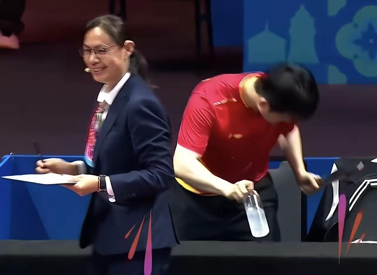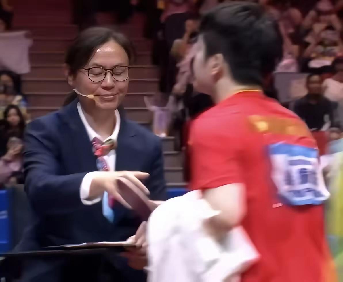 这个戴眼镜的女裁判绝对是樊振东的头号粉丝,比赛结束,樊振东出于礼仪,要过来跟裁判握手致谢。这个裁判还装着很严肃的样子,工作的要求没办法把开心的事情表现出来。 满满的正能量。满满的众望所归。小胖长得喜气!就是天下平安的福相。 女裁判叫牟春蕾,嗓音沙哑,经常执法国际乒乓球比赛。 哈哈哈,我也看出来了的,这个女裁判笑得很开心,我们也开心得不得了