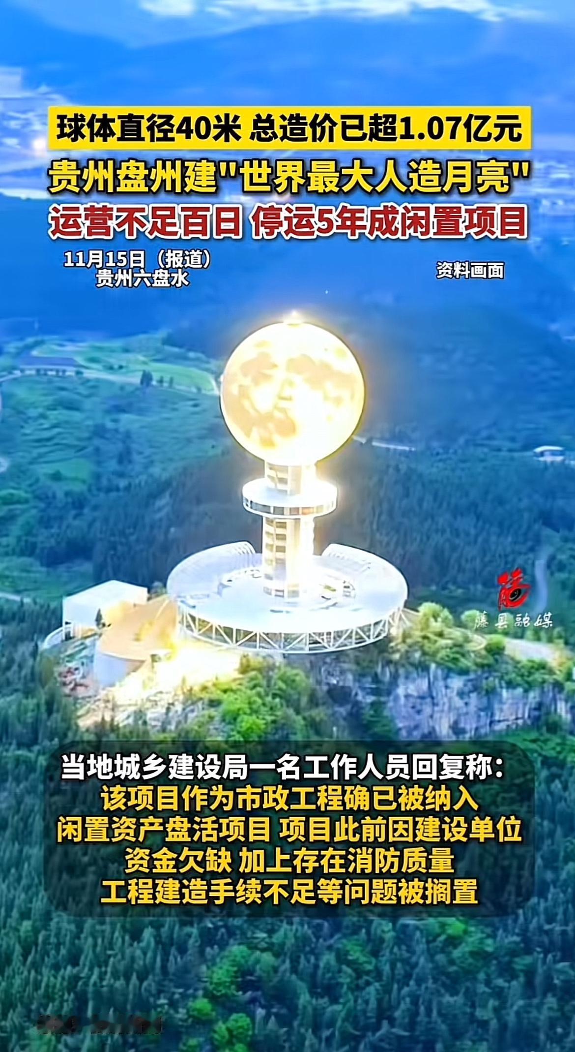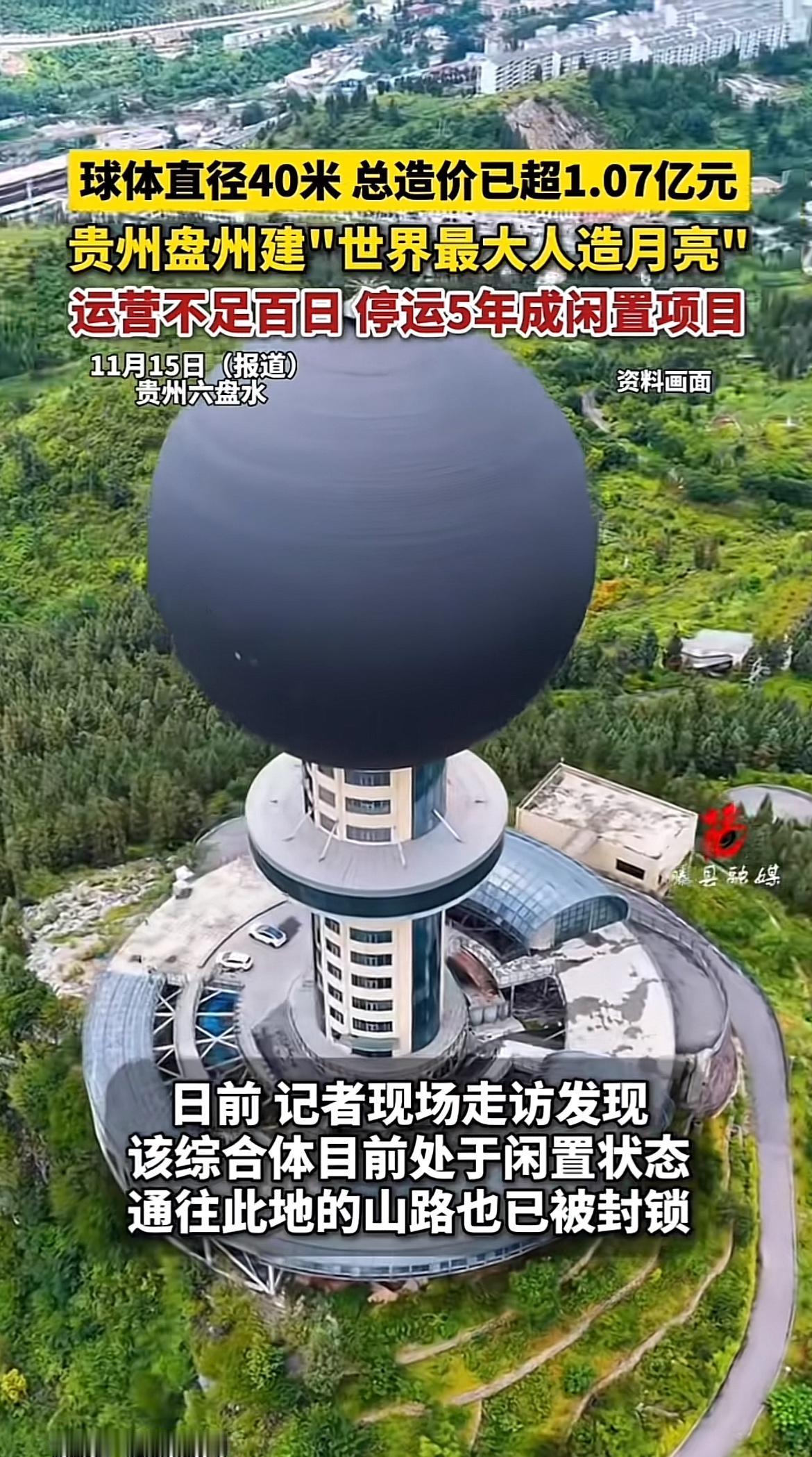 “世界最大人造月亮”这噱头听起来挺牛,建成后却只运营百日就凉凉,还花了超1.07亿,真是让人唏嘘。原本可能是想搞个大项目吸引眼球,带动当地旅游啥的,结果却成了“短命工程”。 这就好比花大价钱搭了个华丽舞台,表演没几场就草草收场。也许是前期规划没做好,没考虑到实际运营成本和受众需求;又或者是宣传没到位,没吸引到足够多的人。这么多钱打了水漂,实在是可惜。希望以后搞项目能更务实,别再整这种“面子工程”了。