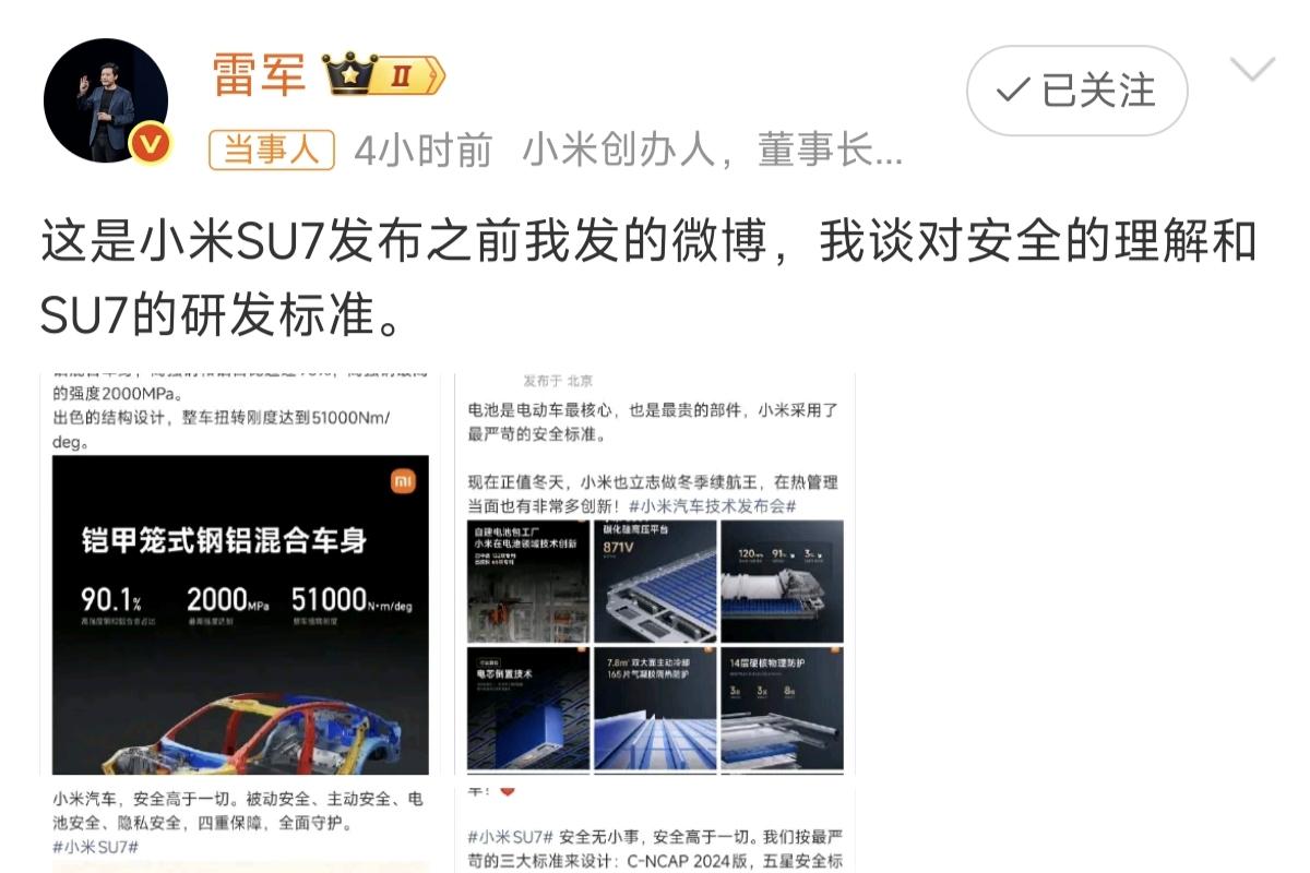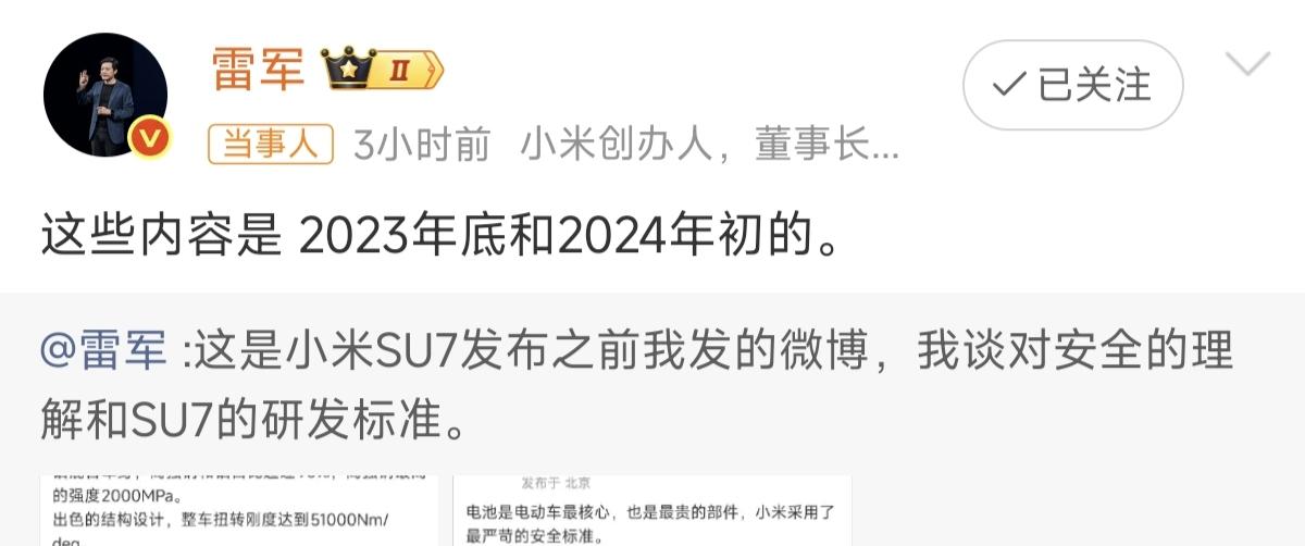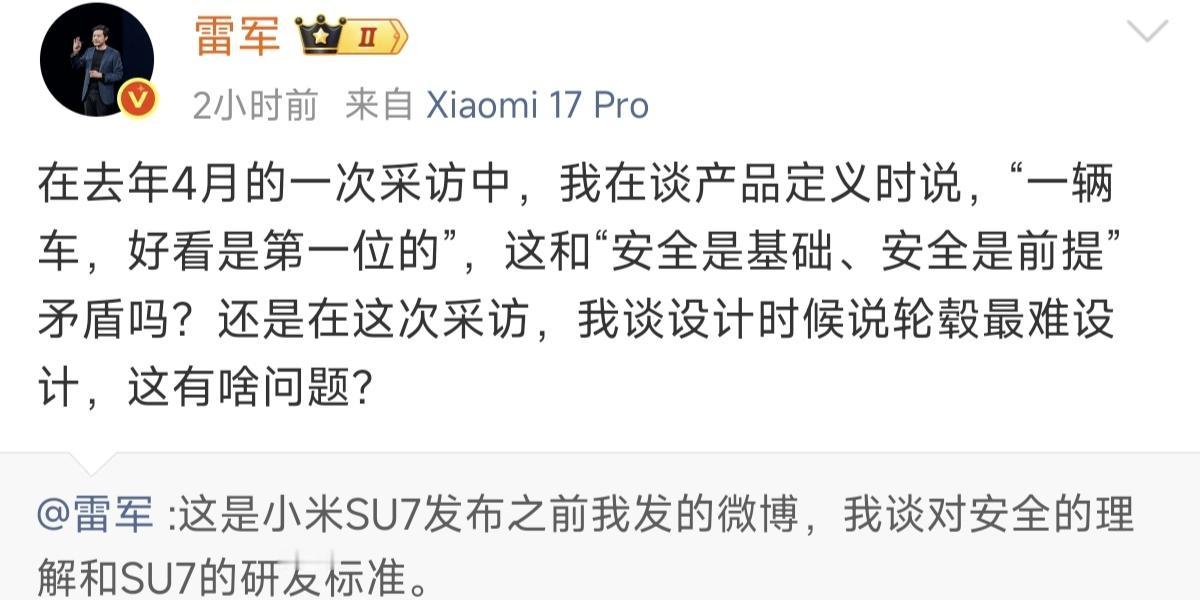 字越少事越大 一天之内,雷军连发多条辟谣 真相水落石出后,喜不喜欢小米的都沉默了。 那句“一辆车,好看是第一位的”,其实是媒体问Xiaomi汽车的外观设计,雷军说出来很正常的回答,但经过断章取义剪辑后,从此被曲解成了外观比安全更重要。 但冷静下来思考,你想想有哪家车企能说出这种话来,而且但凡认真看过发布会的,根本没听到这句“但是我认为,安全不仅仅是豪华,如果没有安全,其实什么都没有”。所以他们根本没看发布会!带节奏的真不怕哪天来个函 说白了,小米汽车在产品设计的优先级上多好看是事实,但和安全是基础、安全是前提”不冲突,二者是不同维度,拿来硬黑那就是坏了。怎么说呢,Xiaomi的流量谁都想来,比如15s pro出来的时候,芯片O1各种arm定制的内容,说句难听的,就是见不得Xiaomi好,带着节奏浑水摸鱼。