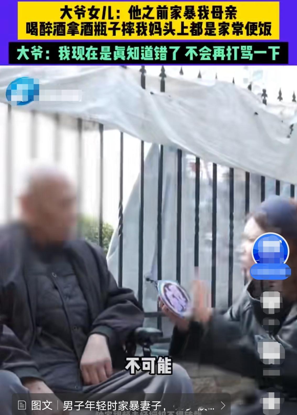 年轻时长期家暴殴打妻子 自己年老坐轮椅了又要求妻儿照顾自己 近日,河南许昌的这位大爷联系媒体 控诉自己的妻子女儿孤立自己 结果记者联系大爷女儿,听到了这番话: “从我记事以来他家暴我母亲,长期家暴,喝醉酒拿着酒瓶子,直接砸我妈头上,给自己的孩子打电话,说不仅得弄死你妈,在弄死你妈之前我得先把你弄死。”记者听后都感到震惊 如今大爷老了坐上了轮椅,希望身边有个人照顾自己,面对记者大爷表示向妻子道歉……大家觉得大爷应该被原谅吗? .