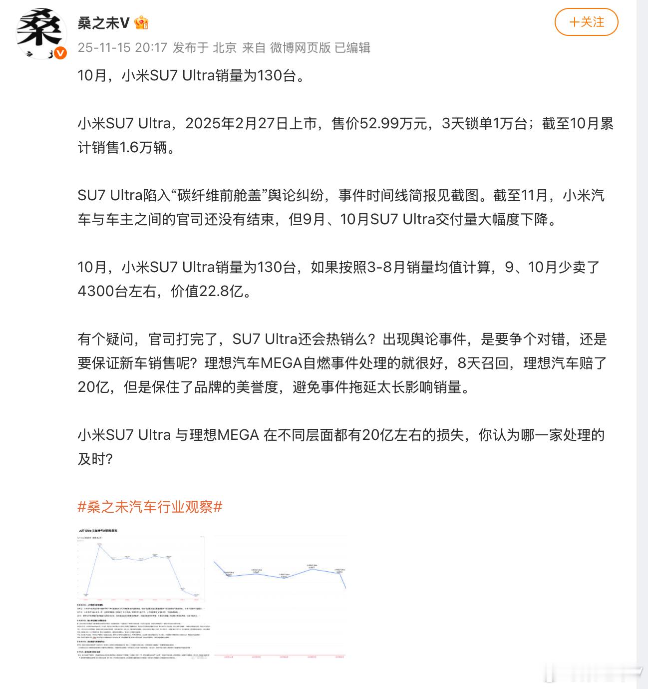 同样20个亿,是理想汽车花得值,还是小米汽车花得值?这两家花钱都比较仔细,在这20亿怎么花方面,理想汽车还是稍稍胜出小米汽车一点点。另外给小米汽车一个建议,要和视频号、抖音搞好关系,我是经常收到“绿化带战神”的小视频推送。互联网社交媒体“坐大”后,就是收税、收保护费的,做事业/实业的公司,是无法回避的。此前有过案例,某品牌掏了7000万,然后…………!图2:小米su7和理想MEGA在10月的销量都环比下滑幅度较大,后续观察观察销量走势。