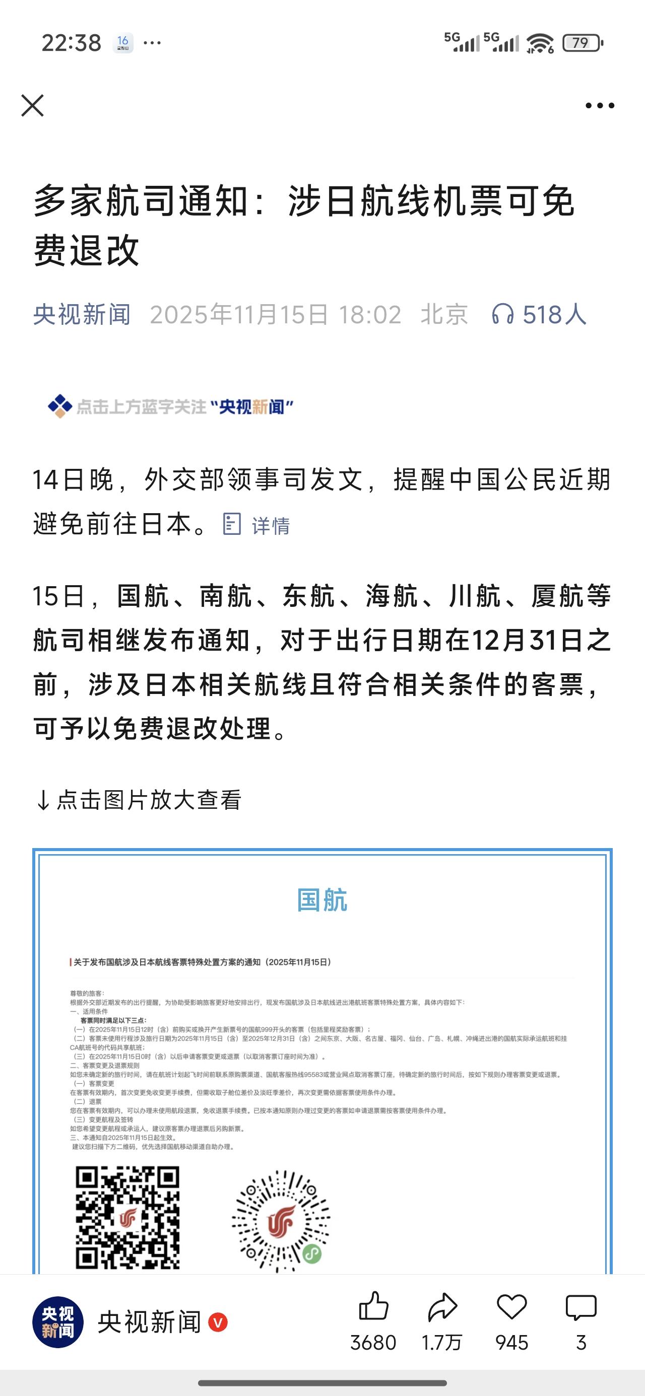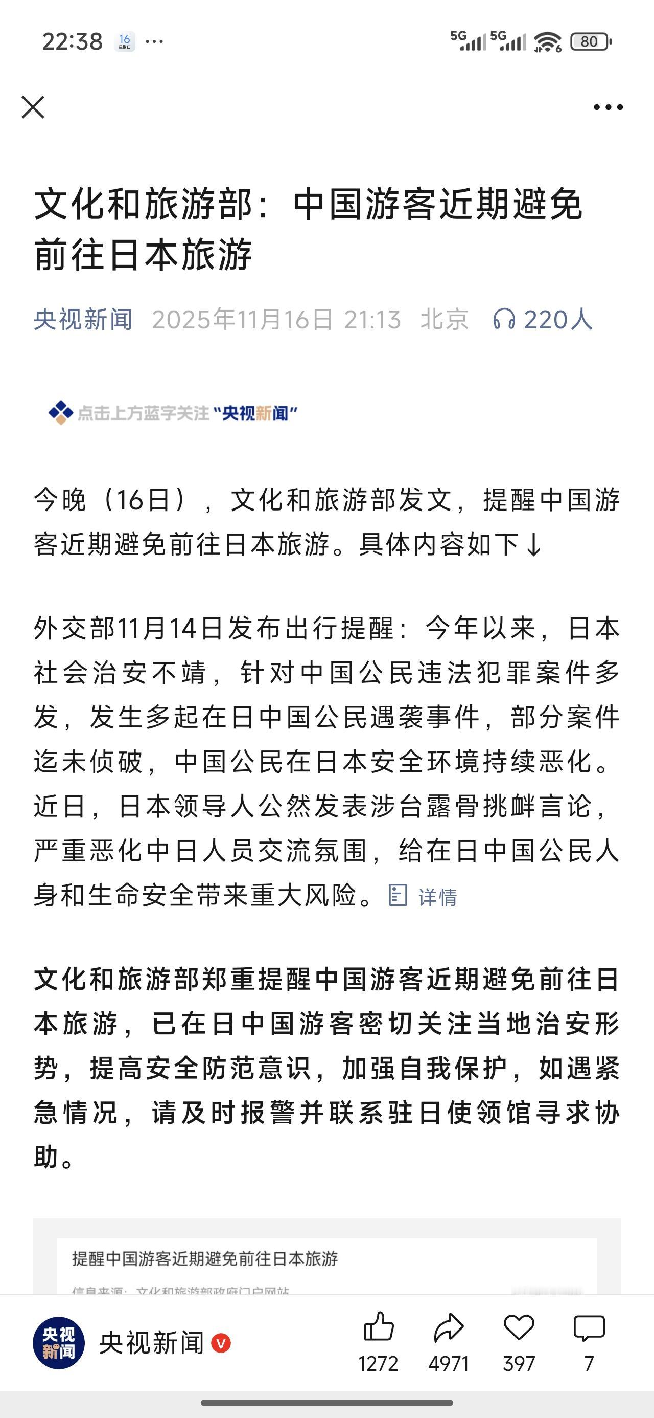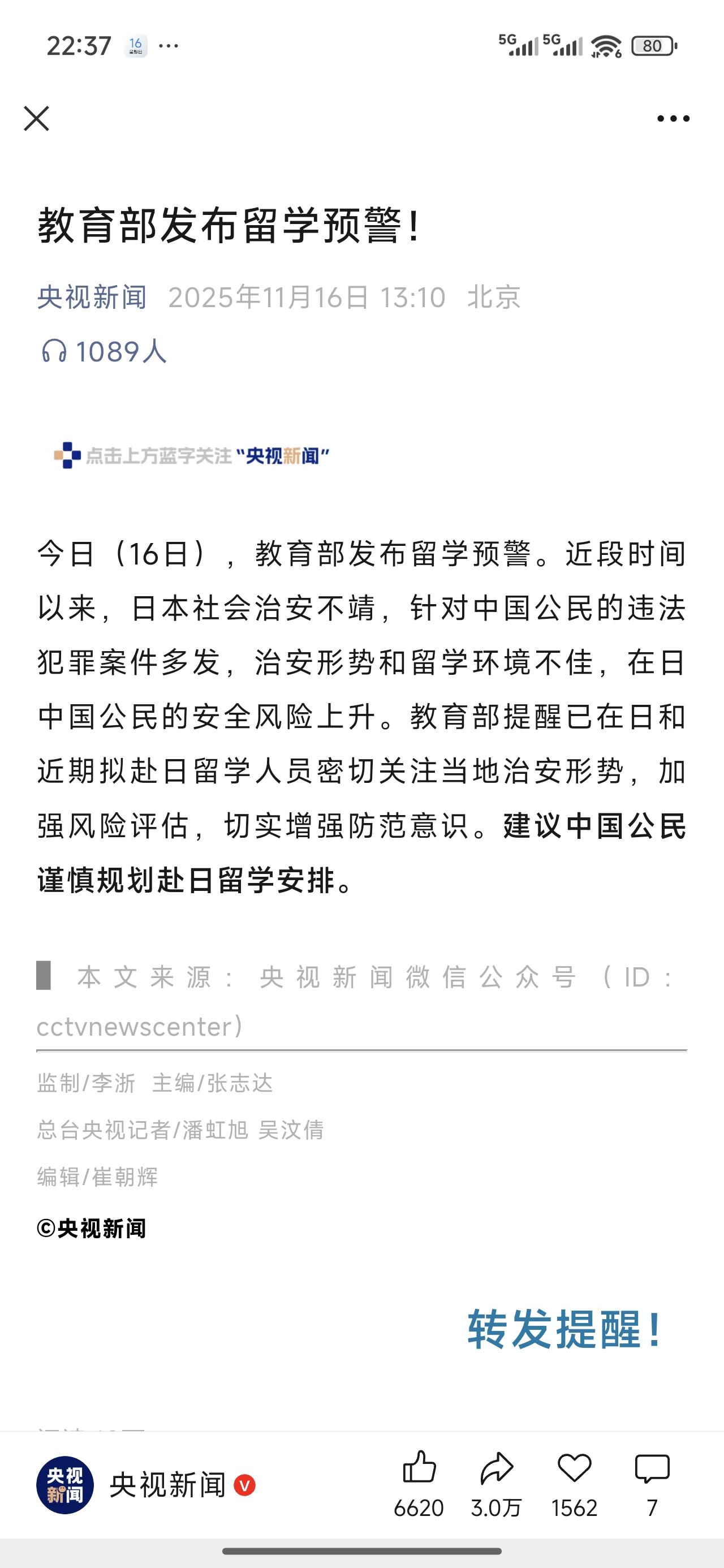 从航空公司提醒买了去日本的机票可以退,到教育部提醒谨慎赴日本留学,再到文化和旅游部提醒避免赴日本旅游,这看似是各自不相关的动作,实则是一系列的组合拳,是应对日本疯婆子不当言行的第一步反制。放心,这只是开胃菜,后续还会有硬菜在候着不知深浅的疯婆子。现在的局势确实很严峻,关键看日本方面是否能悬崖勒马。 日本首相高市早苗的涉华错误言论有多恶劣