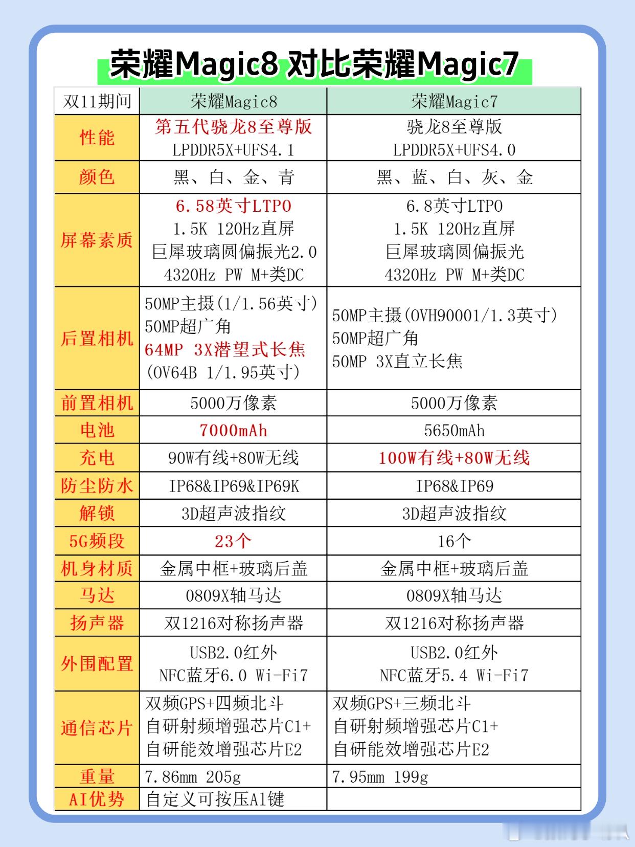 荣耀Magic8 VS Magic7|钱该加在哪儿?Magic8=性能微调+续航暴涨+屏幕护眼黑科技+AI实体化+相机玩法大升级!很多用户在纠结,想买旗舰标准版,但是看Magic8和上代的Magic7不知道怎么选?👍👍Magci8有买新不买旧,性能、续航、长焦、手感都有提升💖💖Magic7作为上代旗舰标准版现在价格更香,并且配置也完全够用⚡️简单说一下区别——性能小升级▫️荣耀Magic8拥有骁龙8 Elite Gen5稳坐安卓一把手+LPDDR5X 9600Mbps满血配置▫️一句话:强得很稳定,日常游戏无压力🔋续航狂飙▪️Magic8:7小时12分▪️充电78分钟充满,但续航焦虑大幅缓解!👀护眼屏卷出新高度✅护眼统计:用眼时长环境全记录✅护眼监测:低头抖腿暗光自动提醒✅个性化显示:定制专属色彩亮度策略►►►荣耀绿洲屏这次把“科学护眼”玩明白了!🤖AI实体按键右侧边框新增可按压键、短按/双击/长按自由定义、一键唤醒YOYO智能体/视频通话、懒人操作效率翻倍✨📸相机玩法暴增▫️新增6种胶片滤镜+AI追色功能▫️抓取参考图色调一键迁移到自己的照片▫️小白也能秒出氛围感大片💡选购指南→ 预算有限但想要最新体验:荣耀Magic8标准版很香→ 如果预算有限,又想体验入门旗舰,荣耀Magic7现在价格更香