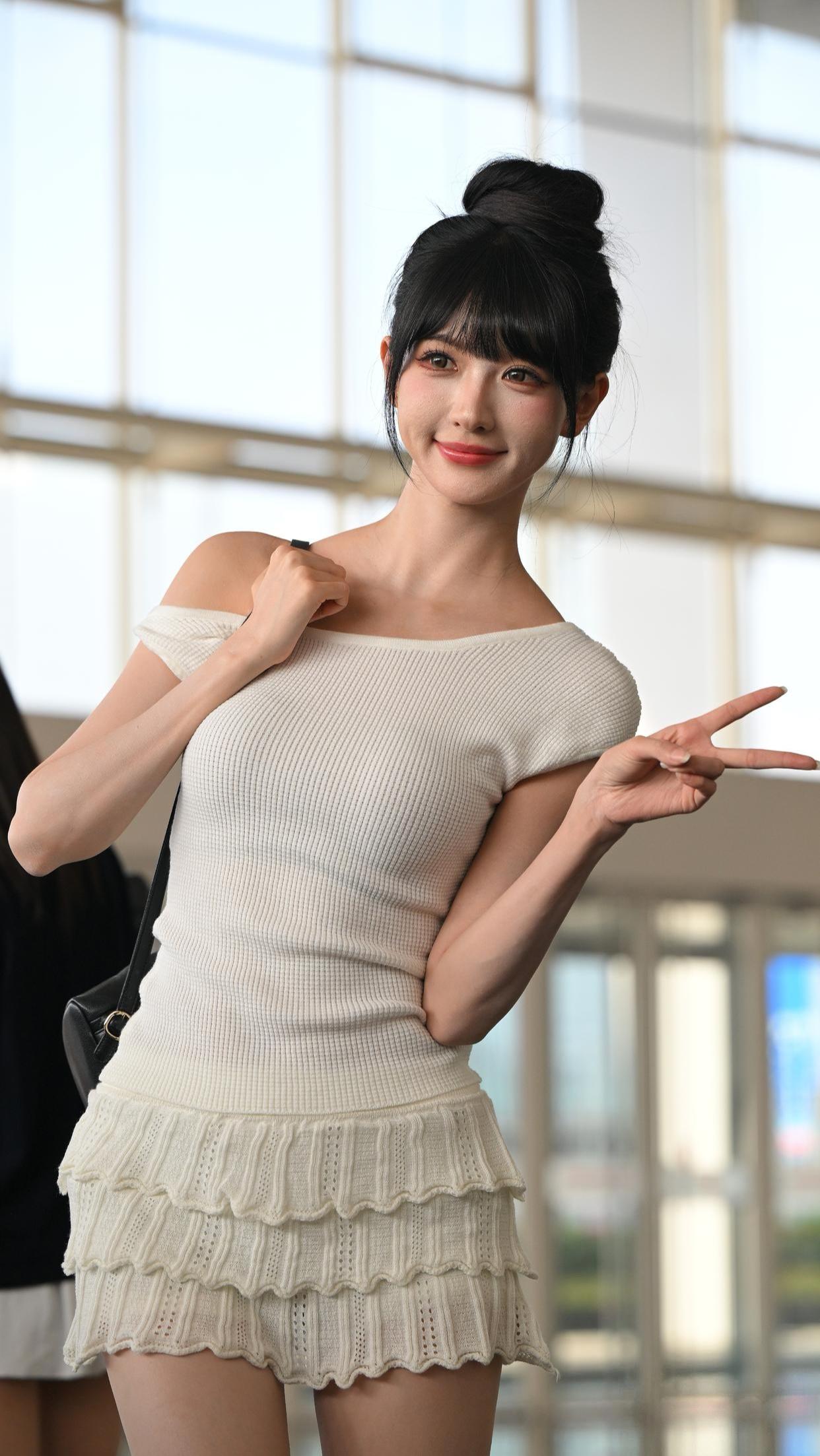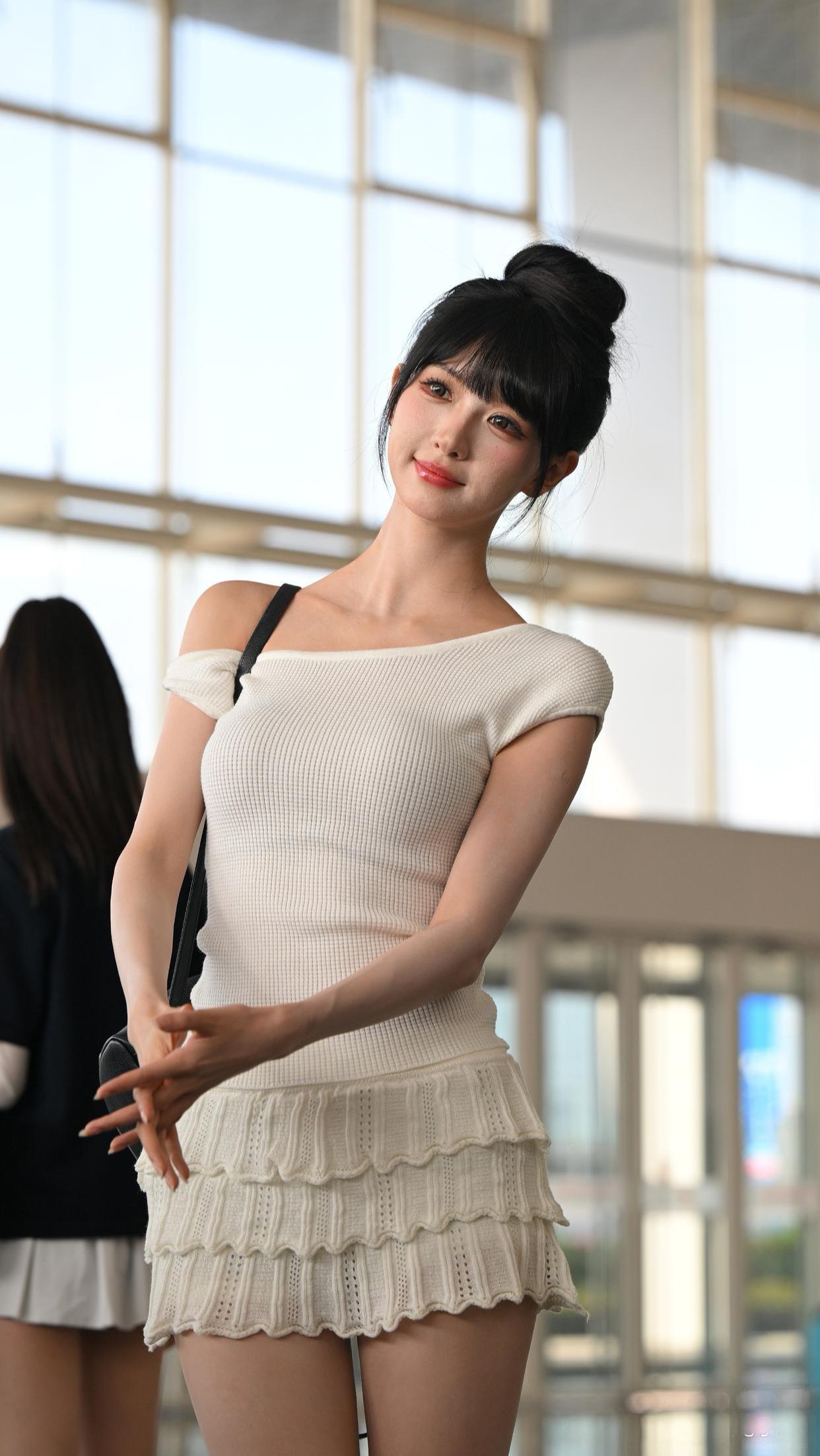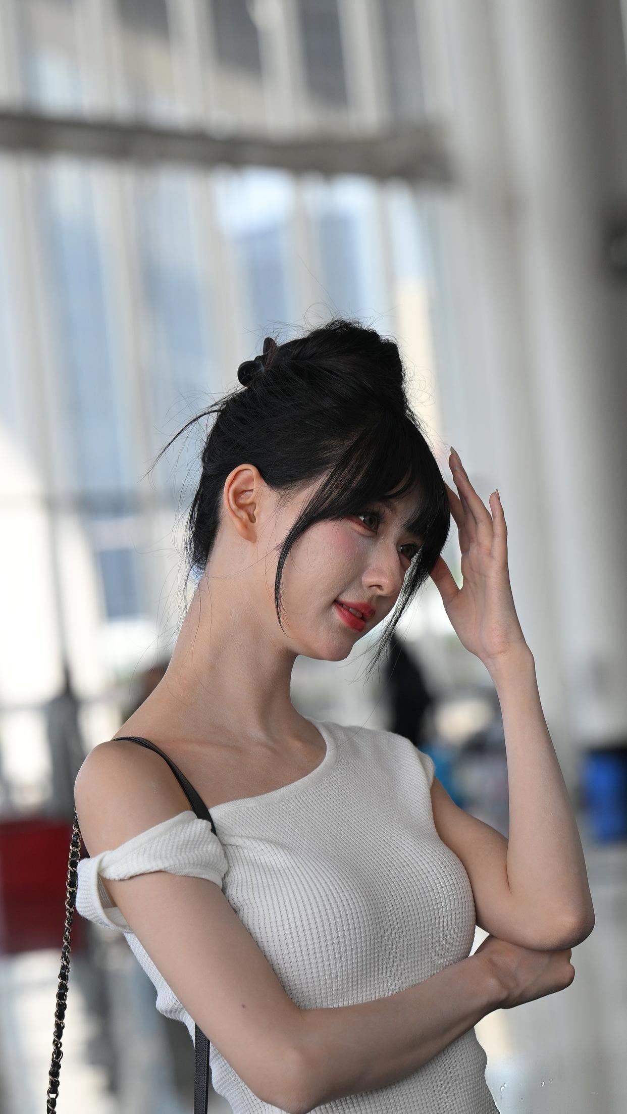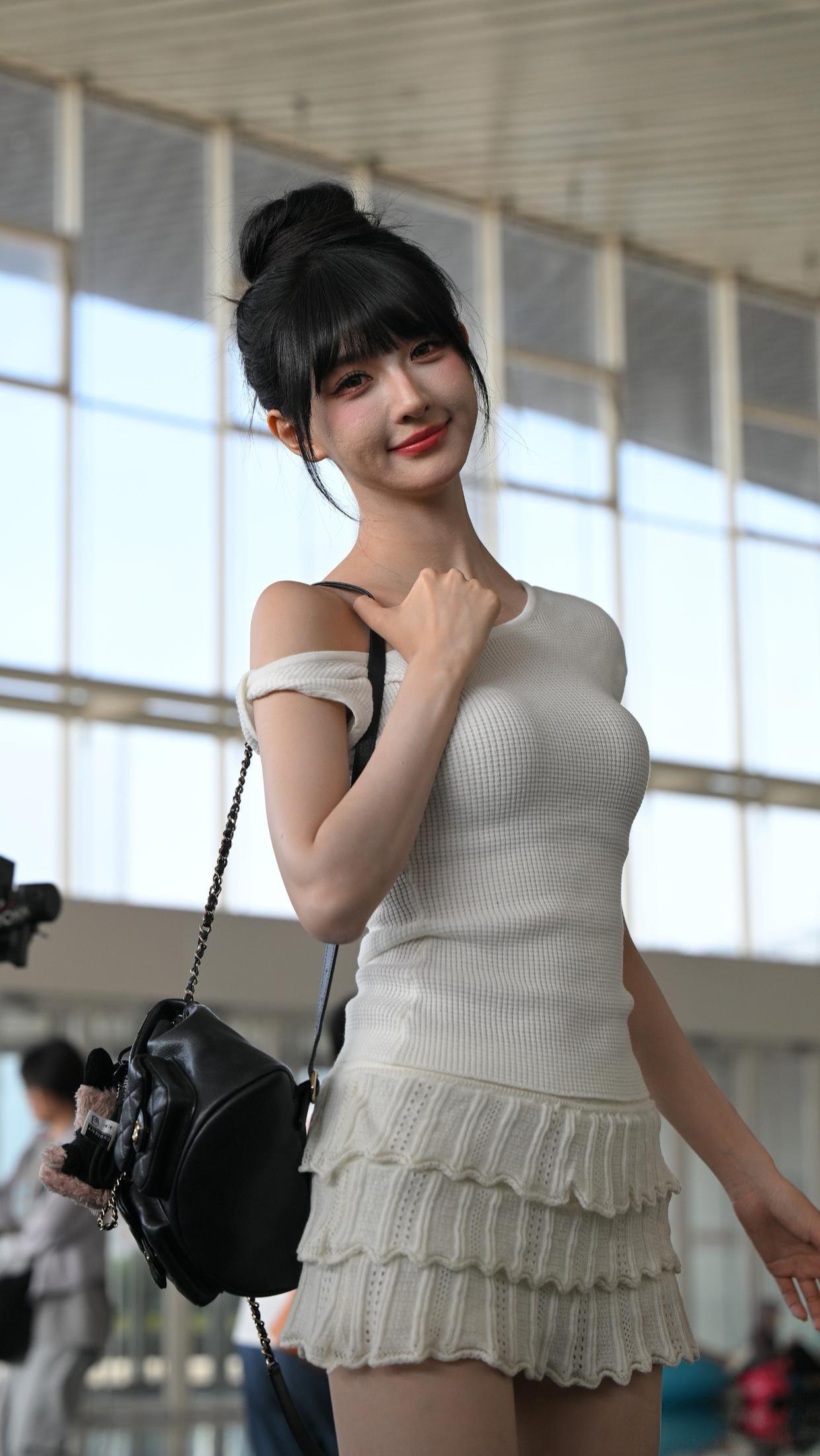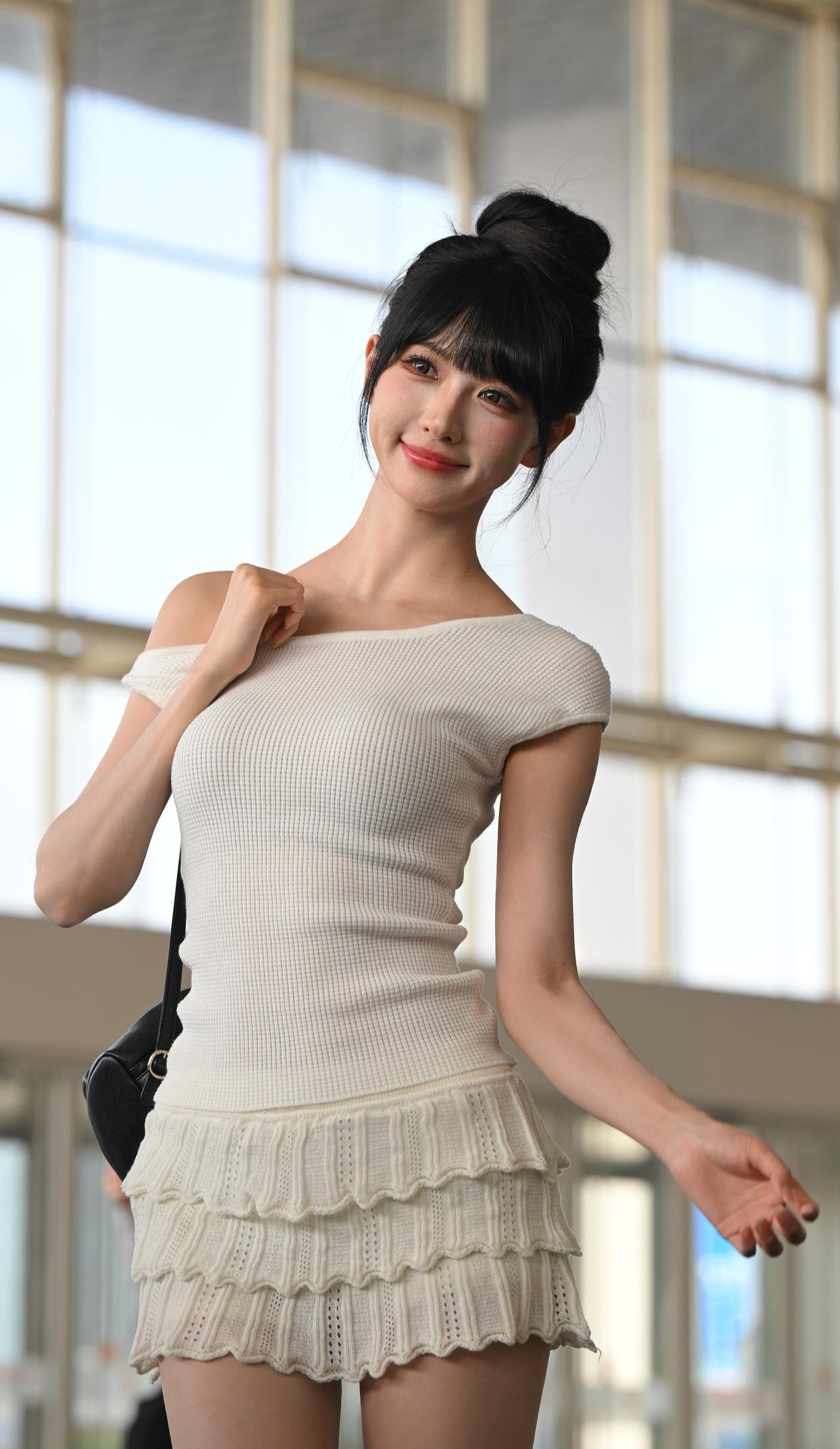 一袭裸色修身裙勾勒苗条曲线,米白开衫轻抚肩头添几分柔婉,粉色凉鞋与白色腋下包碰撞
