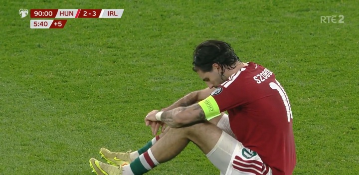 直播吧11月17日讯今日世预赛帕洛特天神下凡,最后时刻绝杀+戴帽,帮助爱尔兰获得附加赛资格,丢球后匈牙利队长索博斯洛伊无奈垂头+瘫坐草地
