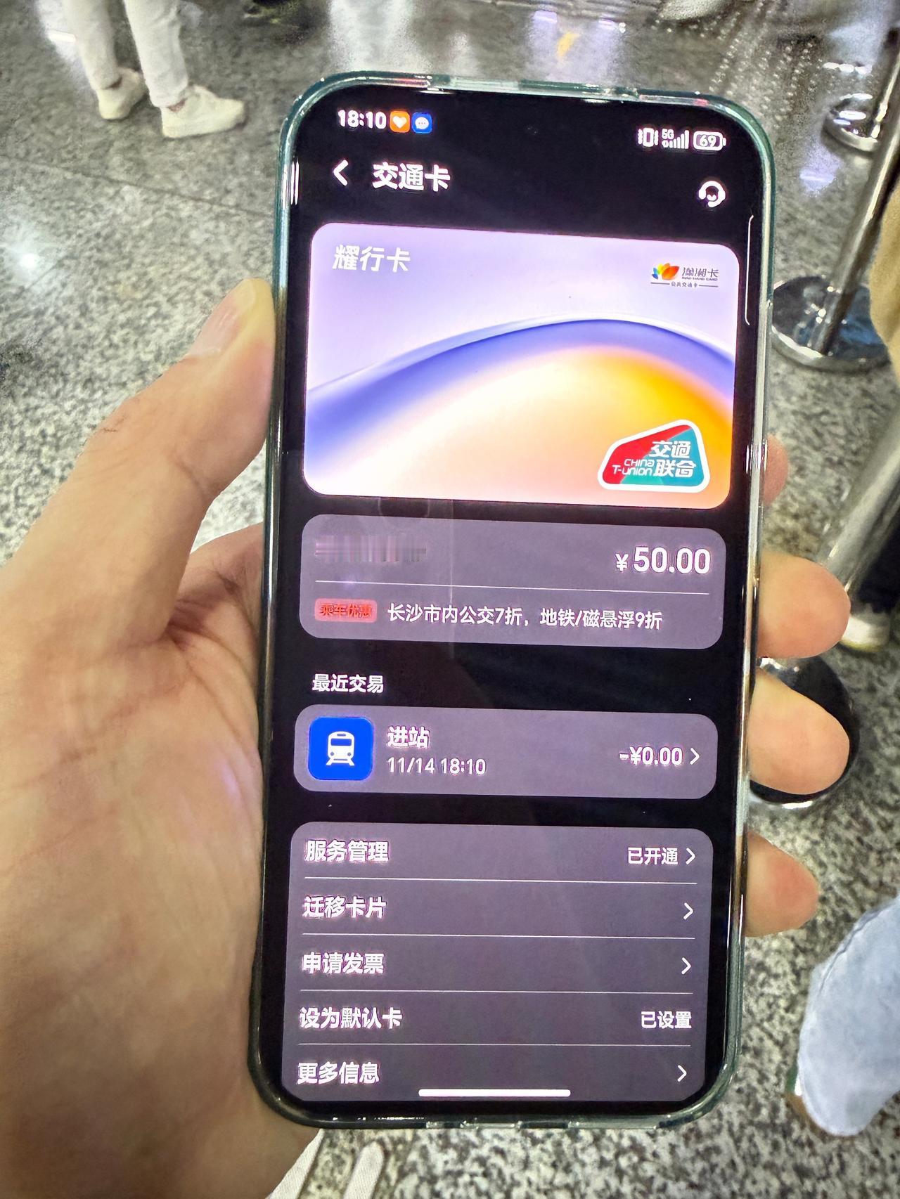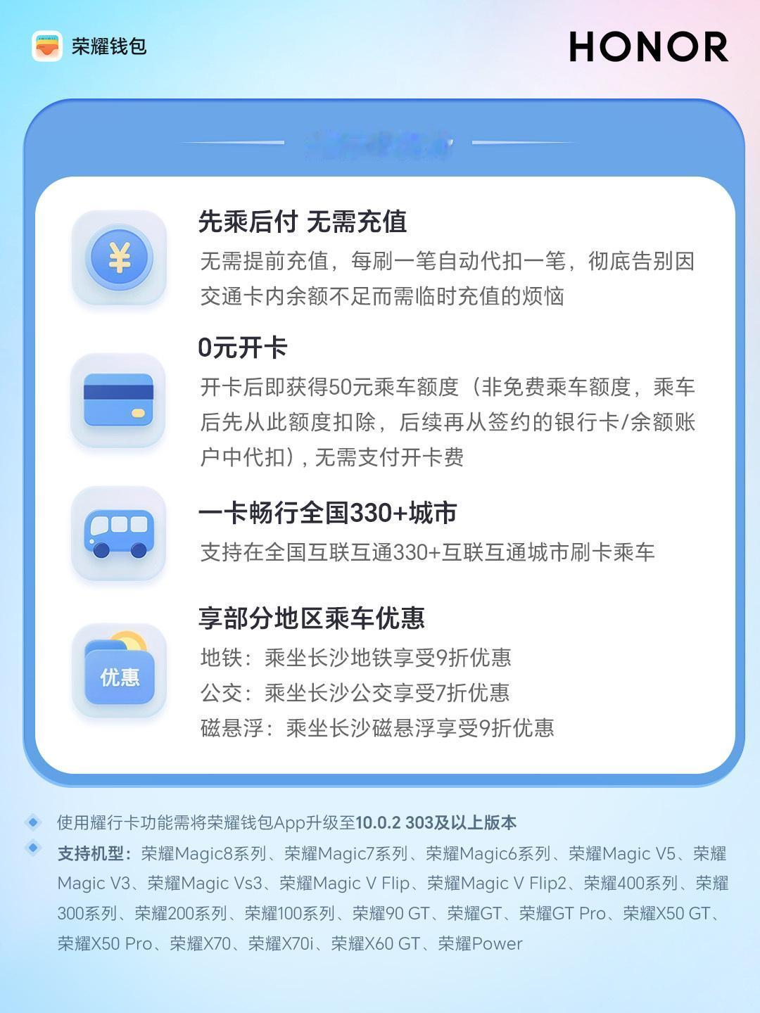 这一波羊毛薅了没有? 特别是有荣耀手机的朋友们,赶紧去哟。 最近推出荣耀「耀行卡」真的值得强烈推荐,实用又便捷!现在免费开卡,在长沙市内公交7折,地铁/磁悬浮9折。 打开荣耀钱包选择乘车 添加耀行卡后,乘地铁只需掏出手机,靠近闸机“嘀”一下即可,全程不到一秒,方便极了!更贴心的是,它支持“先乘后付”,无需提前充值。 目前该功能已支持大多数荣耀机型,包括荣耀100等热门型号。当知道这个信息我也在荣耀Magic8开通这一功能,确实方便又实用!(注:耀行卡的添加步骤详见下图)