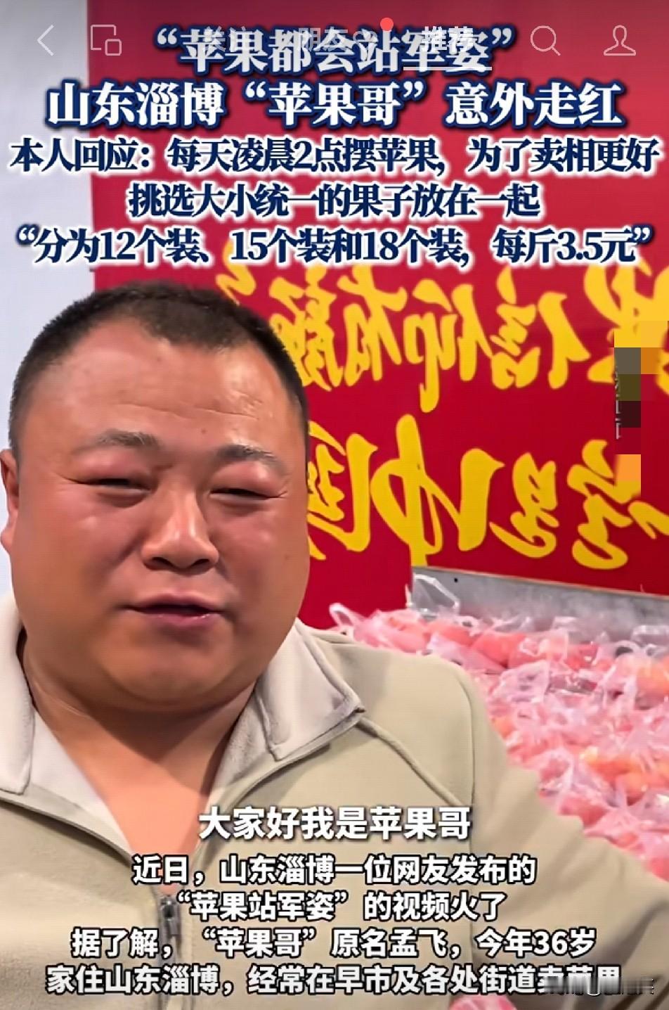 惊到失语 谁能想到卖苹果还能这么卷? 淄博孟哥每天凌晨2点就开工,挑苹果必须大小一致,分12、15、18个装成方袋 摆得整整齐齐跟“站军姿”似的——3.5元一斤的普通苹果,直接火遍全网 网友们都疯了似的问地址 现在好多人做事敷衍,可孟哥把摆摊当正经事较真,反而成了流量黑马 到底是“精致摆摊”成了新潮流 还是咱们骨子里就认“踏实做事”这股劲儿拦路卖苹果 素人苹果哥 淄博苹果哥 淄博小摊贩 分享今日的人生感悟 人生感悟心得分享