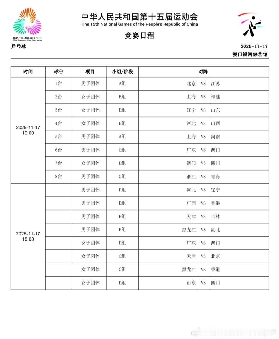 2025年第十五届全运会乒乓球项目第十一比赛日赛程:11月17日 晚场的比赛暂时还没有出桌次安排10:00 男团小组赛 A组 T1:北京VS江苏10:00 女团小组赛 B组 T2:上海VS福建10:00 女团小组赛 D组 T3:辽宁VS山东10:00 女团小组赛 B组 T4:河北VS山西10:00 男团小组赛 A组 T5:上海VS河南10:00 男团小组赛 C组 T6:广东VS澳门10:00 女团小组赛 D组 T7:澳门VS四川10:00 男团小组赛 C组 T8:浙江VS青海18:00 男团小组赛 B组:天津VS吉林18:00 男团小组赛 B组:黑龙江VS湖北18:00 男团小组赛 D组:河北VS辽宁18:00 男团小组赛 D组:广西VS香港18:00 女团小组赛 C组:天津VS北京18:00 女团小组赛 C组:黑龙江VS香港18:00 女团小组赛 D组:山东VS四川 18:00 女团小组赛 D组:广东VS澳门