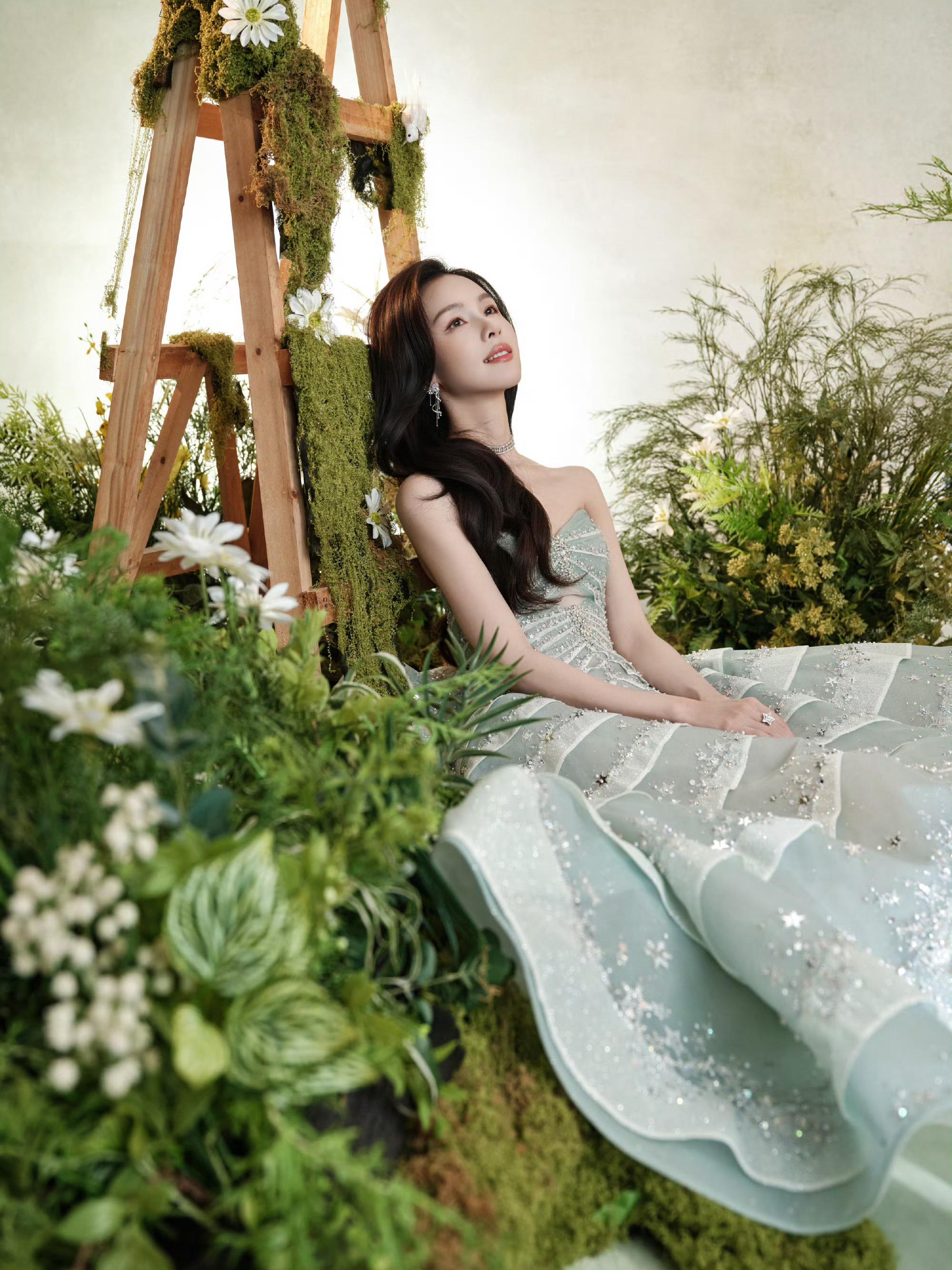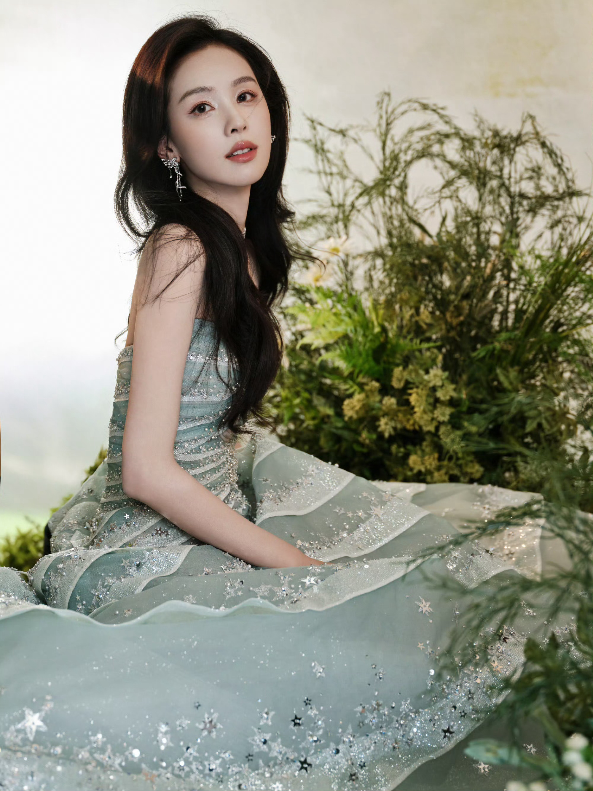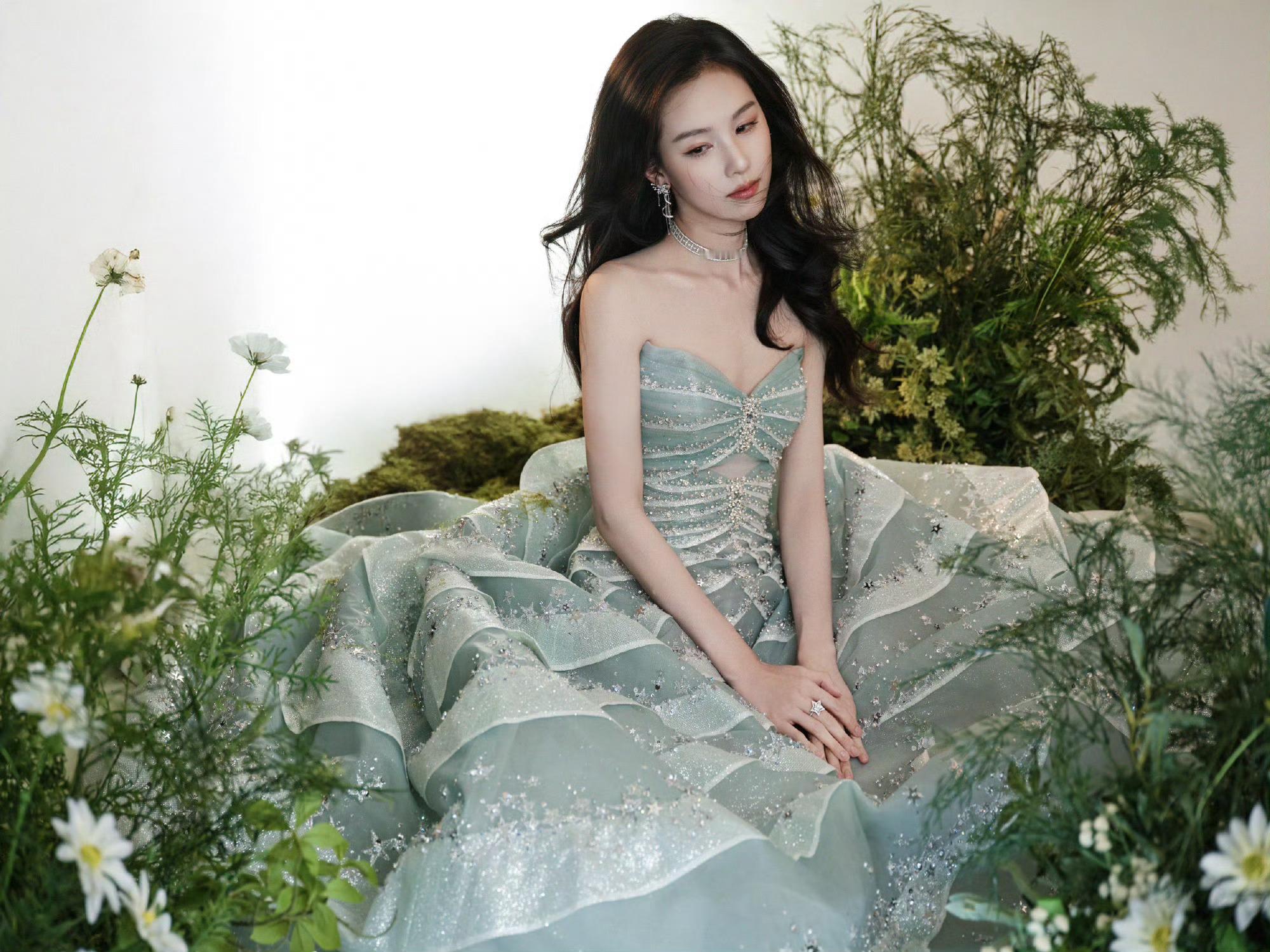 陈都灵身穿薄荷绿抹胸亮片长裙出席深圳“100年润发”活动