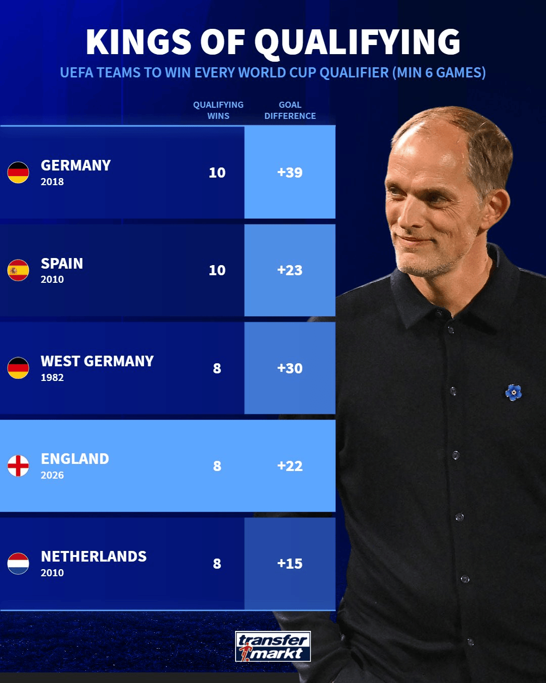 荷兰2010世预赛:8连胜,净胜球+15。