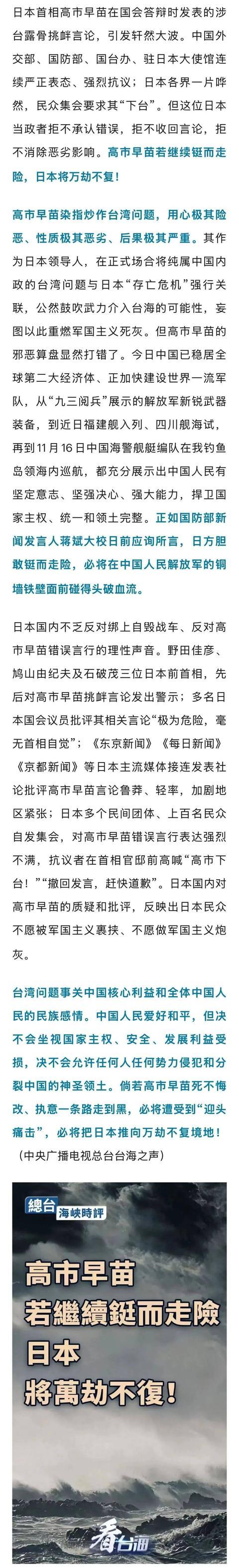 《高市早苗若继续铤而走险,日本将万劫不复!》11月16日,中央广播电视总台以这样一个文章标题,对日本发出前所未有的严厉警告。 中日两国将要走向哪种程度,一切都要看日本的路想要怎么走。如若一意孤行,再要往前,就是万丈深渊。新账老账一块算,这是中国广大人民的心愿。 一举彻底扫平日本军国主义的根基,打掉他们向东亚大陆扩张的野心,为我们的子孙后代,开创永久太平。这不能随便说说,而是到了时候,必须要采取的实际行动!