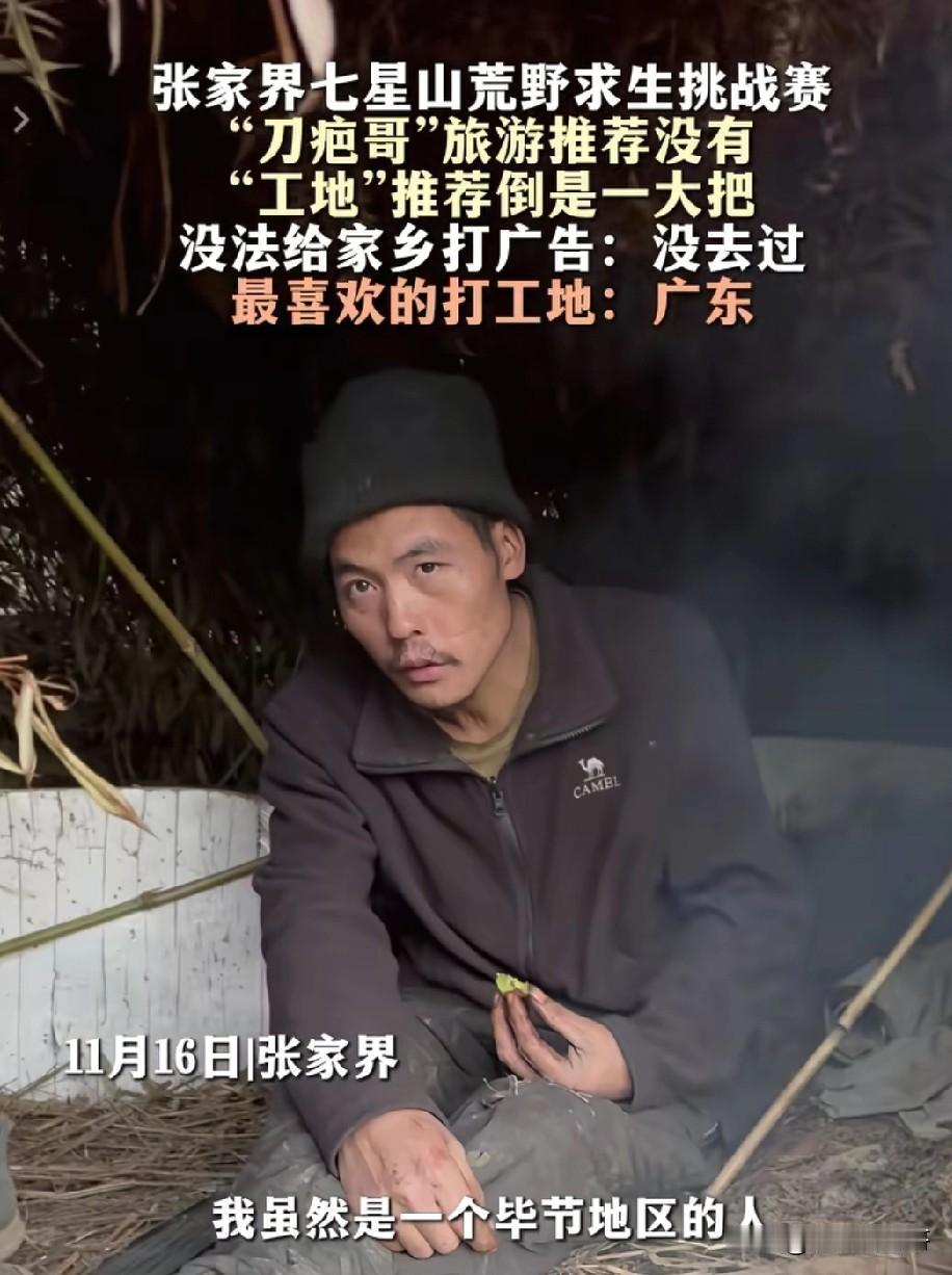网友:毕节文旅尴尬了, 走到一半,回去! 荒野求生刀疤哥“情商”有点让人揪心 , 记者问刀疤哥对你的家乡毕节旅游推荐去哪些地方? 你猜刀疤哥怎么回答,他说我是一个打工的,问我工地有哪些倒是很多。 我虽然是毕节地区的, 但是毕节我一次都没去过 , 连路过都没有 。 让我给家乡打广告,我真的不了解 , 不知道怎么打 。 记者就问他,要你给一个城市打广告的话,你给哪一个城市打 。 刀疤哥我说我一个打工的,我打什么广告 , 不会打,打不来 。 这刀疤哥真的实诚,实诚到毕节人看了也生不起气。 毕节去都没去过,如果为了广告说毕节是个好地方,欢迎来玩, 反而会感觉到太假 !