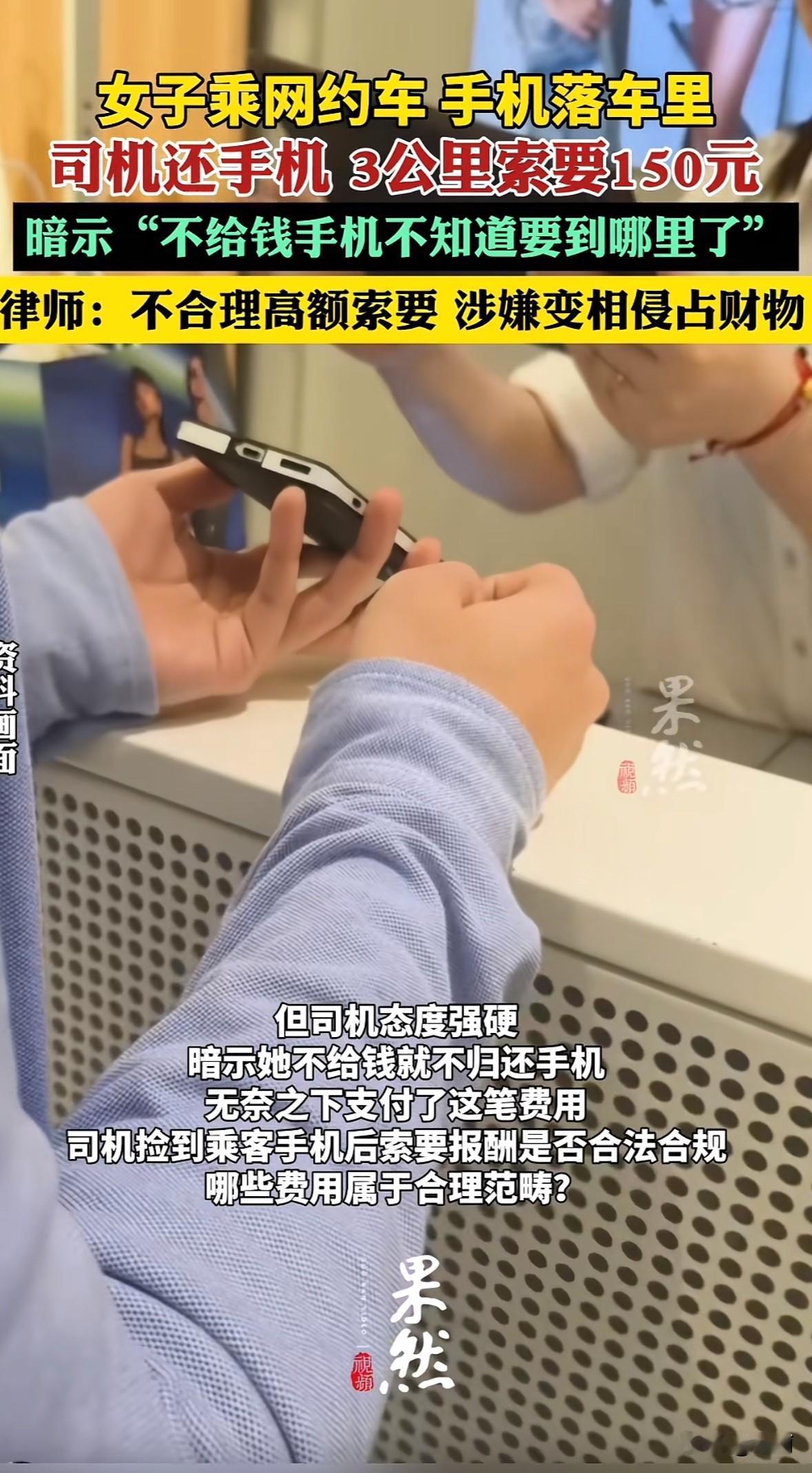 广东李女士乘网约车丢了手机,联系司机后主动提给100元报酬,可司机说取消订单有损失,非要150元,还暗示“不给钱不知手机去哪”。李女士发现司机就离自己3公里,还是迫于压力付了钱。 这事引发不少讨论,其实按法律规定,拾得人能要保管、交通等必要费用,但不能漫天要价。3公里要150元明显超出合理范围,还带着威胁意味,已经不合适了。 拾金不昧是美德,司机帮忙还东西该得合理补偿,可高额索酬就变味了。遇到这种情况,乘客也不用慌,能跟平台投诉,必要时还能通过法律维权,双方互相体谅才好。