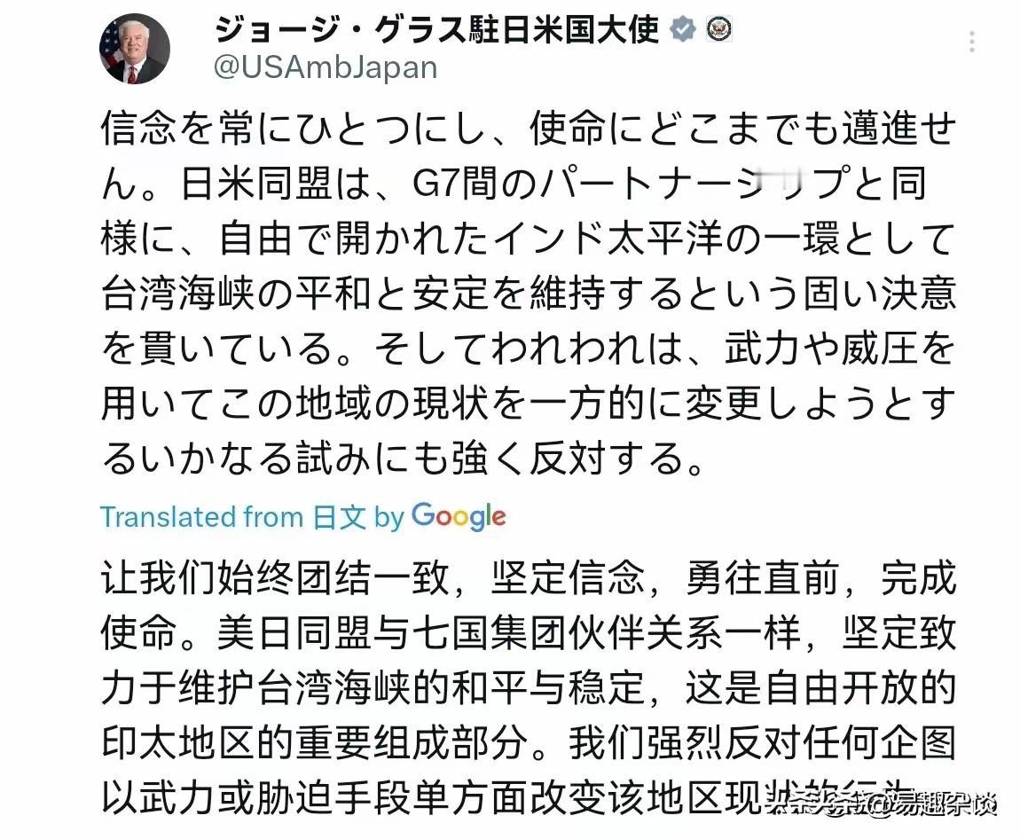 美国驻日大使今天公然将台海与所谓“印太安全”捆绑,扬言反对“单方面改变现状”。这种话术根本是为日本武力干预铺路。美日同盟越来越像搅乱亚太的“麻烦制造机”,我们必须看清其干涉中国内政的本质。