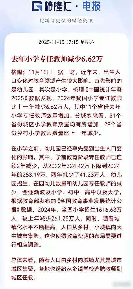 人口变化的冲击波真的杀疯了!2024年幼儿园新招生才971万,而今年小学新生还有1616万,这意味着2027年小学招生直接砍半,只剩现在的60%。 幼师已经先扛下了所有。 这数据太吓人了。幼儿园关停潮早就开始了,没想到小学这么快就要跟上。 2024年幼儿园数量比上年少了2.11万所,多少幼师连夜失业,或是被迫转行,曾经热闹的校园如今只剩空荡荡的教室。 所谓的“冲击波”从来不是突然降临,而是出生人口连年下滑的必然结果,只是我们总在数据刺痛时才猛然惊醒。 更扎心的是连锁反应,有人预言2033年初中、2036年高中都会迎来关停潮,教育行业的调整才刚刚拉开序幕。 教师编制早已亮起红灯,湖北鄂州“锁死”编制总量,南昌进贤县全面停招,缩编裁员的压力正从学前教育蔓延到小学。 别以为只是学校和老师受影响,配套的教辅机构、校园周边商铺,都会因生源锐减陷入经营困境,多米诺骨牌已经倒下。 《教育强国建设规划纲要》提出跨学段调配教师,可小学老师转岗初中谈何容易?专业差异、教学节奏都是实打实的门槛。 现在小学教职工生师比17.31:1,低于国家19:1的标准,看似超编,可乡村小规模学校仍缺全科教师,结构性矛盾突出。 一边是部分地区教师过剩,一边是紧缺学科、偏远学校招人难,僵化的编制管理让资源无法灵活流动,加剧了失衡。 人口变化倒逼教育改革,与其被动应对关停缩编,不如趁机优化资源配置,让富余师资转化为小班化教学的优势。 这场变革没有旁观者,家长、从业者、政策制定者都得面对,如何在人口变局中守住教育质量,才是真正的考验。 各位读者你们怎么看?欢迎在评论区讨论。人口趋势变化 出生人口新趋势 新出生人口下降 小学生数量下降