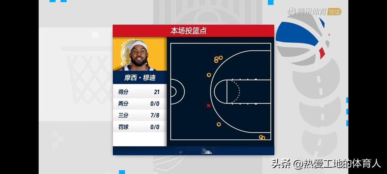 摩西摩西 我是穆迪💥 爆炸输出八分钟三分8中7狂砍21分 今天的穆迪要爆啊 勇士客场挑战鹈鹕的首节比赛,库里还没有进三分的情况下,穆迪已经破个人纪录的轰进7记三分,怎么投怎么有,各种不讲理进球。 一起看接下来的比赛吧,期待穆迪本场比赛的发挥。 看来勇士今天能再赢一场了,加油勇士!
