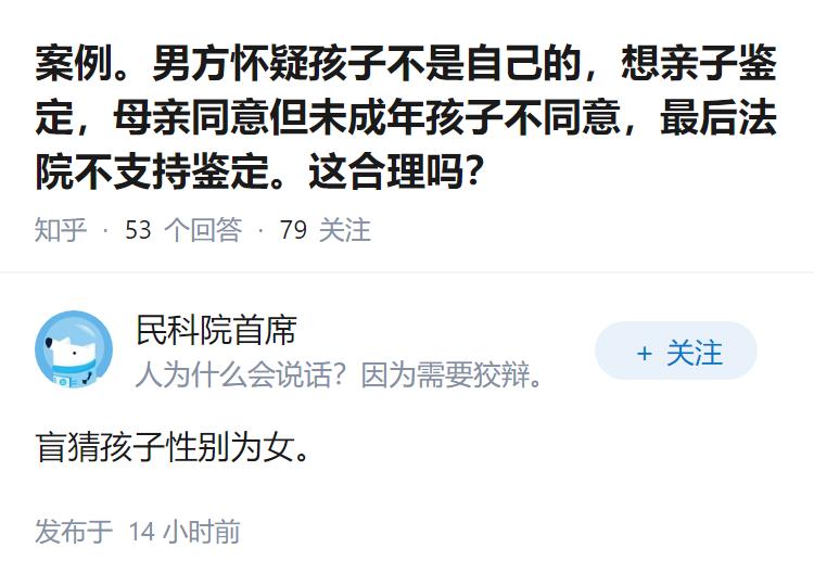 案例。男方怀疑孩子不是自己的,想亲子鉴定,母亲同意但未成年孩子不同意,最后法院不