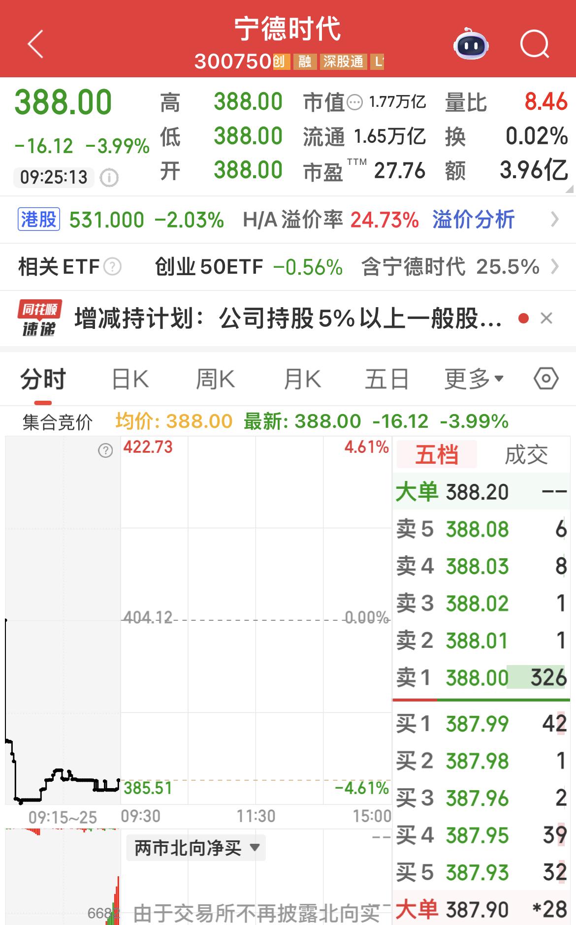 宁德时代开盘下跌3.99 %。 下跌原因:第三大股东拟出让占总股本1%的股份,按当前市值计算规模约180多亿元。