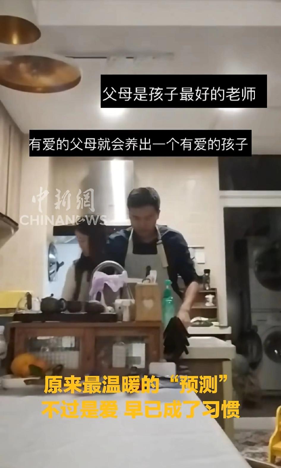 “这也太幸福了吧!”广西,一男孩“预测”爸爸回家,会直接去厨房找妈妈。父母是孩子的最好老师。 男孩猜爸爸回家会直接去厨房帮妈妈忙。结果爸爸回来先亲了一下儿子,随后带好围裙去厨房帮妈妈炒菜。这样温馨的画面被儿子记录了下来。 网友对此也议论纷纷,有网友说:“ 孩子怎么会不懂得幸福感,长大后的他一定同样爱他的妻子。” 还有网友说:“我爸也是一下班无论多累都会去厨房帮我妈铲子接过来干活,还不忘嘲讽我一句怎么不去帮你妈干活。” 也有网友说:“ 这是双向奔赴,媳妇已经在开始做饭了,试想一下,一进门冷锅冷灶的,旁边还有个人翘着二郎腿刷着手机等你回来做呢。” 父母用自己的行为习惯,给孩子做出了榜样,孩子在这样的家庭氛围中成长,一定会受到耳濡目染,长大了也一定是个暖男 ,爱护妻子和孩子 。 冬日生活打卡季 (信息来源:新华社 )