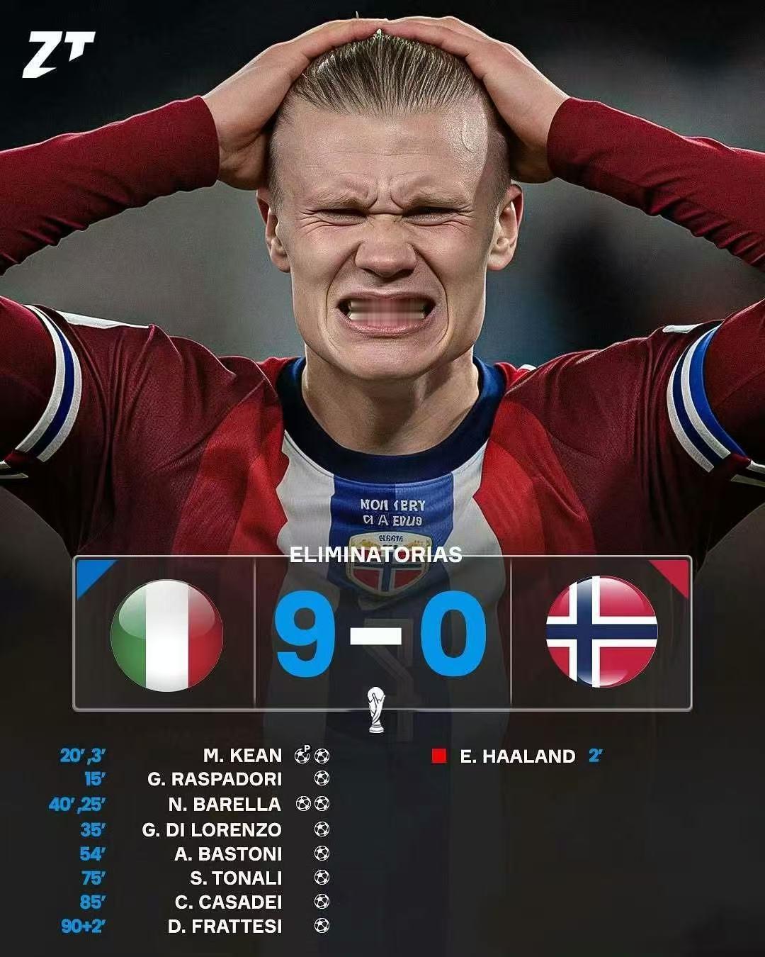 9比0成了笑话! 赛前很多球迷P图,意大利9比0胜挪威,仿佛奇迹会发生一样。但是现实却是当头一棒,意大利1比4惨败给挪威。很多球迷表示,就现在的意大利,即使国足来也赢不了9个球,那支曾经的蓝星军团只能在球迷的记忆里了。
