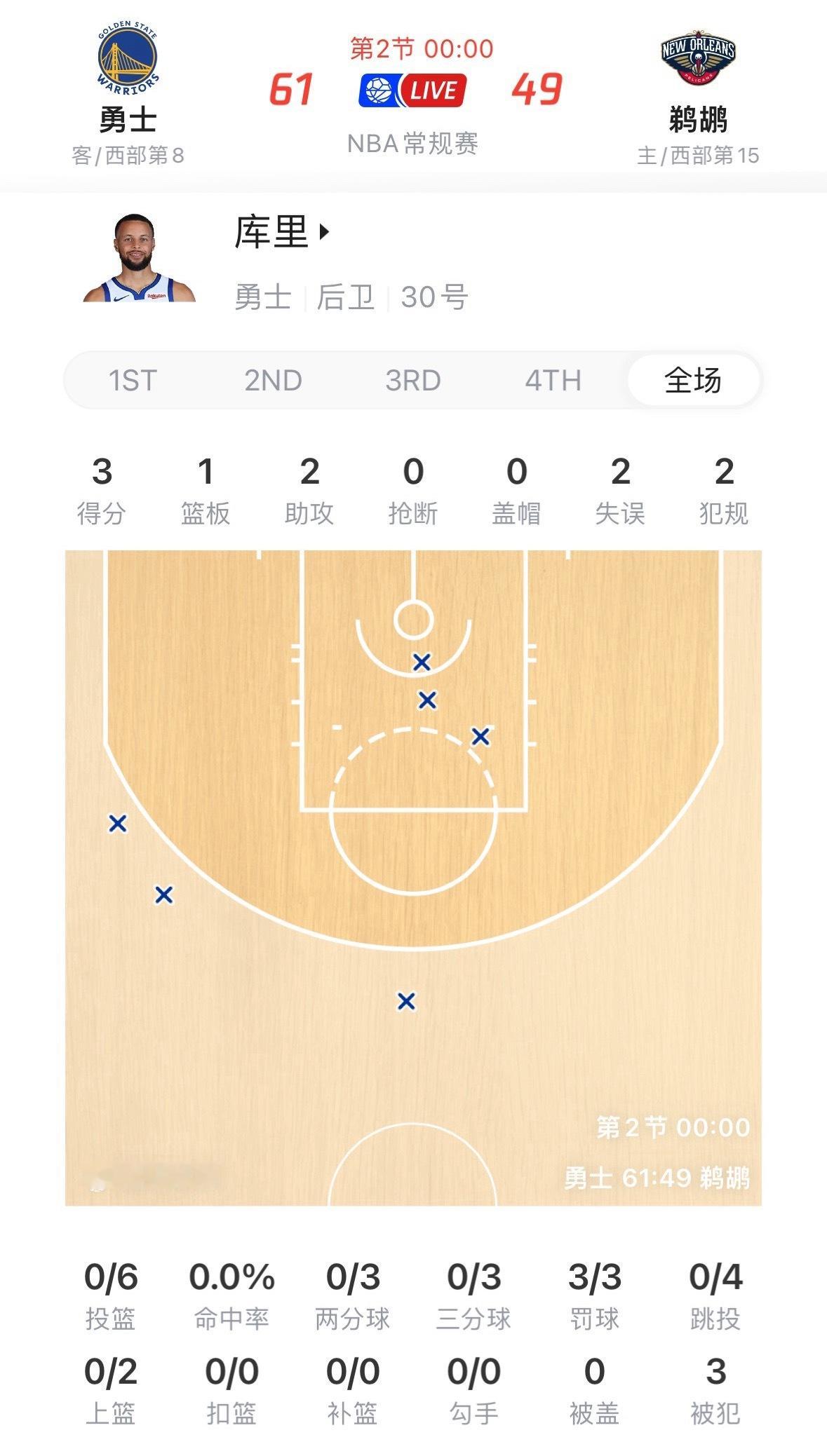 库里半场6投0中,得到3分2助攻2失误,正负值+14。