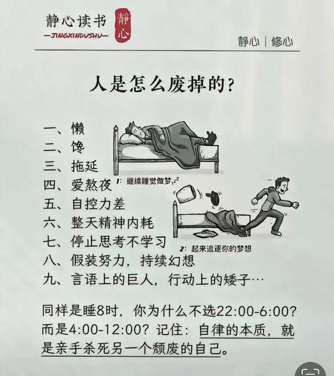 废掉一个人,只需要9件事 (扎心但真实) “再睡5分钟”“明天再开始吧” 你是不是也总被这几句话拖进“废掉循环”? 这9个“废掉信号”,中了3个以上要警惕: 1. 懒到床粘人,闹钟叫不醒 2. 馋得管不住嘴,身材失控 3. 拖延成习惯,deadline踩点选手 4. 熬夜到凌晨,白天困成“行尸” 5. 自控力为0,手机一刷半天没 6. 精神内耗到失眠,啥事没干先累瘫 7. 脑子“生锈”:刷短视频代替思考,一年读不完1本书 8. 假装努力:朋友圈打卡学习,书里没翻3页 9. 嘴强王者:“我要暴富”挂嘴边,连早起都做不到 同样睡8小时 22:00-6:00是“充电模式” 4:00-12:00是“报废模式” 别等废掉才惊醒: 自律从不是“苦行僧”,而是亲手把颓废的自己“拉上岸”—— 今天起,把“再等等”换成“现在做”,你早晚会谢谢此刻的自己。 这就是人的现状 人是感悟图 人 你问我答 废掉你的习惯