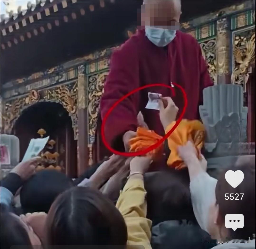 这是什么情况?只见台下众人手拿不同面值的钞票争先恐后的递给台上戴口罩的和尚,难道现在都不用去到菩萨面前了,全部由和尚出来代收了。