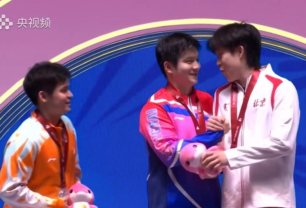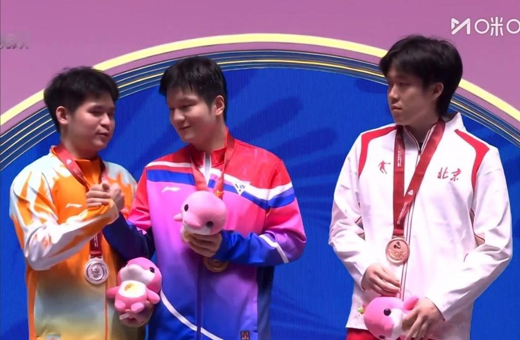 男单颁奖典礼,林诗栋主动和东哥握手,樊振东又主动和王楚钦握手,三兄弟都开心的笑了