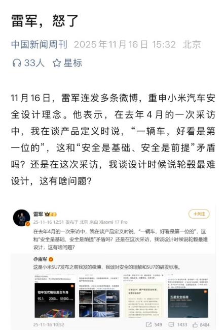 雷军,怒了。看到新闻周刊这个标题,着实让人震惊。雷军一向温文尔雅、和蔼可亲,不赚钱,只是为了交朋友,怎么可能会怒呢?仔细一看,原来是汽车好看是第一位的,与汽车安全之争。
