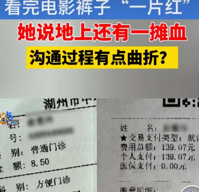 浙江湖州,一女子在影院看完电影,发现裤子屁股后面全是血,可把她吓够呛,她跑到卫生