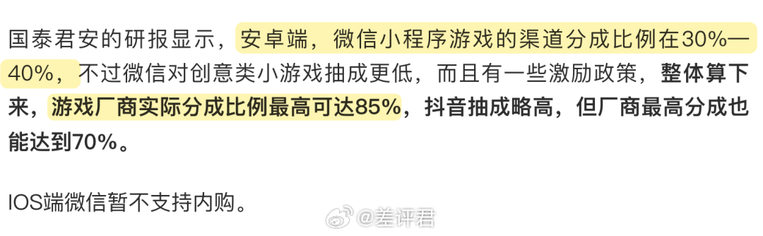 一年多的拉锯战,苹果和腾讯终于握手言和了——苹果要在微信小程序收15%的“税”。众所周知,按照苹果的规矩,App内购买虚拟商品必须走苹果支付,这样它能抽成15%~30%。但因为一直没和苹果谈拢税,微信小程序绕开了这套规则,开发者想收钱只能想办法:跳转客服发链接、引导到公众号、跳转H5页面,来调用微信支付。这苹果能不急吗?要知道小游戏这块肉太肥了。根据《2024年1-6月中国游戏产业报告》,上半年小游戏实销收入166亿,同比暴涨60.5%。其中内购收入91亿,同比飙升81.56%。于是双方开始了漫长的博弈。这俩巨头比谁都懂谈判,他俩不是第一次吵架,也不是第一次和好。就像小区门口的下棋大爷,昨天还在拍桌子,今天照样凑一桌。其实对腾讯来说,好处很大。首先,安卓端的微信小游戏,腾讯会抽掉30%-40%佣金。但在iOS端,由于没和苹果达成协议,腾讯一直没开放虚拟支付,所以它在内购上赚的钱是0。所以我推测,苹果动了筷子,腾讯说不定也得吃上两嘴,但大概会降低抽成比例。对于开发者来说,主要就是看苹果支付带来的收益,能否抵消掉这些抽佣。苹果用户:?
