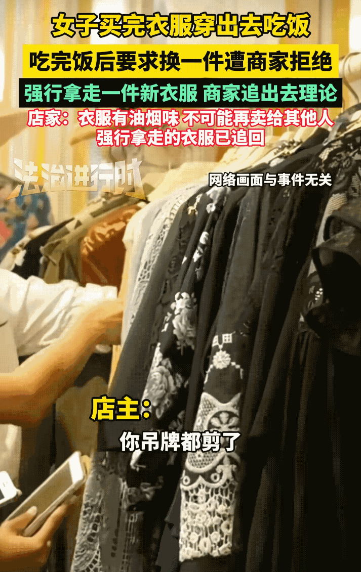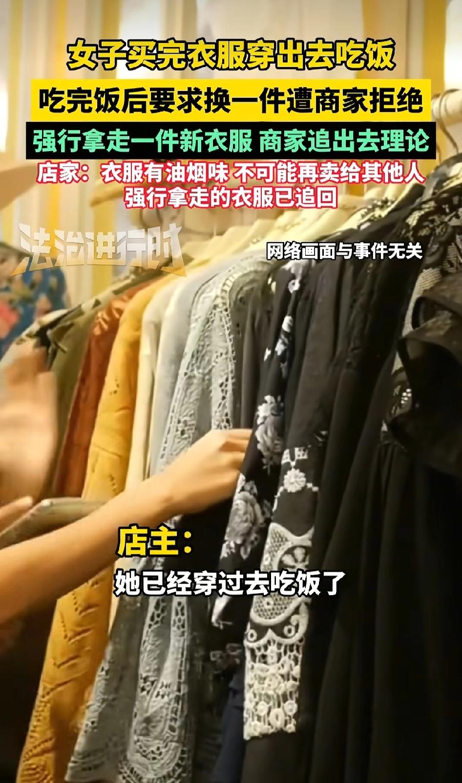 “万万没想到啊!”江苏南通,一女子买完新衣服穿着去吃饭,结果吃完饭找到商家要求换一件。 根据法治进行时的报道,女子穿着新买的衣服去吃饭 ,2小时后找商家换 ,商家直接拒绝,因为衣服已经穿过,吊牌已经剪掉 ,而且衣服还有油烟味,不可能再卖给别人 。 网友热议,实体店没有七天无理由退货,因为她已经试过已经满意了才买单。跟网店不一样没见实物才有七天。 其实,女子在买这件衣服的时候已经试过了,而且是满意了才会买的 。她穿着这件衣服去吃饭,身上肯定会留有油烟味 。要找商家换一件,这种做法实在不合理 。 对此事你有什么看法 ? 晒图笔记大赛 (信息来源:法治进行时)