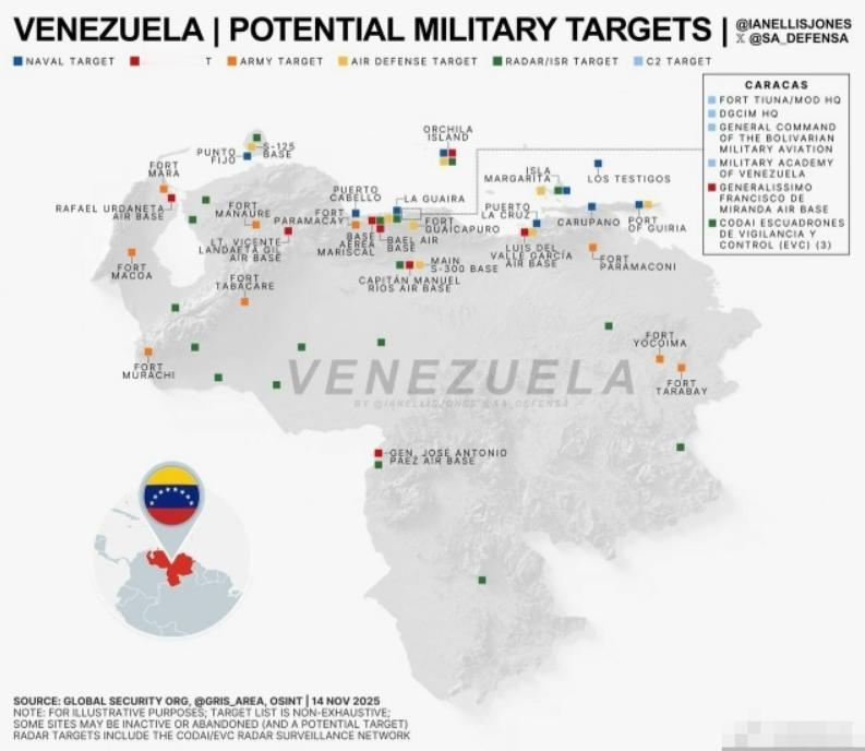 委内瑞拉所有潜在军事目标! 美国在加勒比海集结了一支庞大的海军和地面部队,能够同时打击委内瑞拉的数十个军事目标,但是迟迟不敢动手!博主觉得局座曾经说过一句话,美国人是深深的记住了:美国一旦陷入一场错误的战争,就会像曾经辉煌的西班牙和英大英帝国一样,彻底地衰落,再也回不到昔日的巅峰。 从局座说出这句话以后,美国决心就没有之前那么强了。即便也是开战,也是派空军部队去轰炸一番就好了,不会派陆军部队深入登陆作战。因为一旦陷入内陆作战,那就再也拔不出来了。所以局座一席话,胜读十年书,美国也是非常慎重。 要打一个国家之前,也是想了又想,到现在美国军队在委内瑞拉外海,徘徊了那么长时间,都不敢动手。关键是缺乏一个借口,因为委内瑞拉有没有什么特别大的罪行,哪怕是美国说的贩卖白面到美国,那也是一个不大不小的问题。 哥伦比亚和墨西哥贩运白面到美国,要多得多,也没见美国开战,所以说这种这样的理由,是不成立的。美国现在就是不敢开战,估计最终可能就是有序的撤走,因为承担不起战败的风险,或者陷入战争泥潭,那就麻烦了。