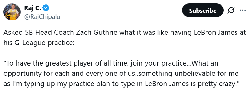 赛后,南湾湖主教练扎克-古斯里接受了记者的采访,被问及勒布朗-詹姆斯现身G联赛训练是一种怎样的体验时,他表示: