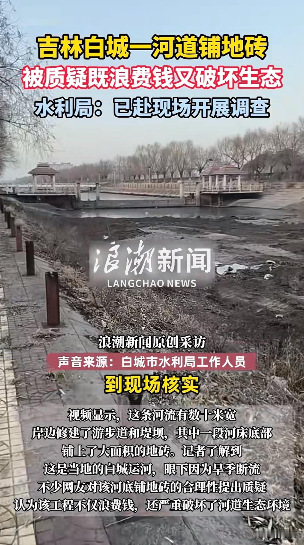 吉林白城运河旱季断流,中段河床被铺了大面积地砖,这事引发不少网友质疑,说既浪费钱又破坏生态。网友担心,地砖会挡住河水渗漏补给地下水,还会影响水生生物生存,让河道没了自净能力。 白城市水利局已经接到反映,派了人去现场调查,后续会给反馈。其实河道铺砖这种“河底硬化”,早有争议,优点是能防冲刷、看着干净,但缺点也明显,会破坏生态平衡。 民生工程得兼顾实用和生态,花钱要花在刀刃上。希望调查能说清施工初衷和实际影响,不管是为了啥,都得尊重自然规律,别搞“面子工程”,毕竟生态保护才是长久之计。