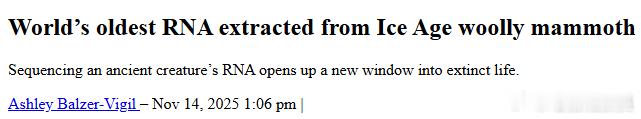 Cell刊文:在猛犸象体内发现世上最古老的RNA !11 月 14 日,发表于《细胞》(Cell)上的一项新研究显示,一个国际研究团队从一头在西伯利亚永久冻土中冰封约 4 万年的幼年猛犸象“尤卡”(Yuka)体内,成功提取并测序了迄今为止世界上最古老的 RNA,这为我们对“逝去世界”的理解提供了另一重维度。此前的考古研究在提取古生物 DNA 方面已经取得突破,但 RNA 分子远比 DNA 脆弱,且会在生物体死亡后迅速降解,学界一度认为其不可能在古老样本中存留。得益于永久冻土的极寒环境,猛犸象“尤卡”的身体组织或许得以保留部分 RNA。 在这项研究中,瑞典斯德哥尔摩大学(Stockholm University)的研究人员采用了针对古老、片段化 RNA 分子的处理方法,通过特殊化学处理手段成功得到“尤卡”的 RNA 片段。与相对稳定却只能提供遗传信息的 DNA 不同,RNA 作为中间信使,有助于理解生物体的微观动态,揭示生物体在生命最后时刻,体内哪些基因是活跃的。对“尤卡”RNA 的分析显示,其死前肌肉紧绷,细胞发出应激信号,这与其死于洞狮攻击的推测相符。此外,RNA 与 DNA 的联合分析还挑战了此前对“尤卡”的性别鉴定:其外部解剖结构特征为雌性,但在组织样本中却检测到了仅属于雄性的 Y 染色体序列。该技术为研究其他已灭绝物种(如渡渡鸟、恐狼等)提供了全新视角,有望更好地重建和验证古生物基因组,甚至可检测出古生物是否感染过流感等 RNA 病毒、比较灭绝物种与现存物种之间的基因表达差异,可以为理解濒危物种演化提供关键信息。