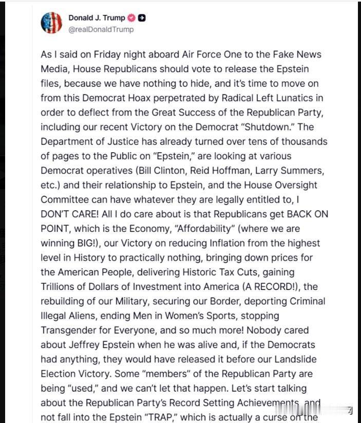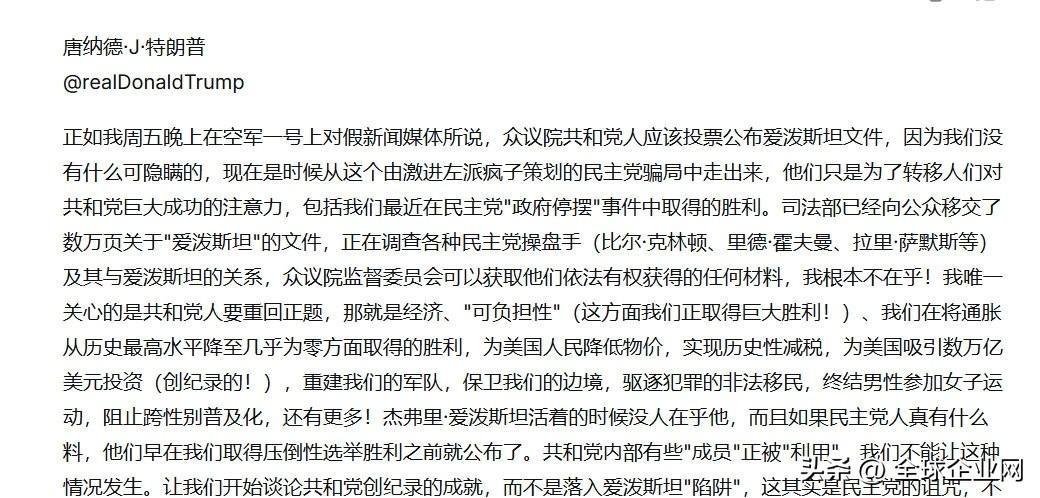 特朗普:“众议院共和党人应该投票公布爱泼斯坦的文件,因为我们没有什么可隐瞒的。”原文如下: