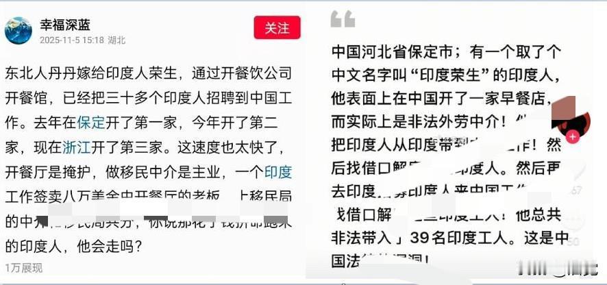 河北保定女子教科书级演示 如何雇佣印度人 2023年嫁给印度人 跟印度公婆签证办好 一家人齐齐整整来中国团聚 有人爆出 其实他们做的是非法劳工中介生意 开餐厅是做掩护弄工作签 高价安排印度人工作 来后就开除 陆续弄了39个来到中国 这些印度人随后滞留中国
