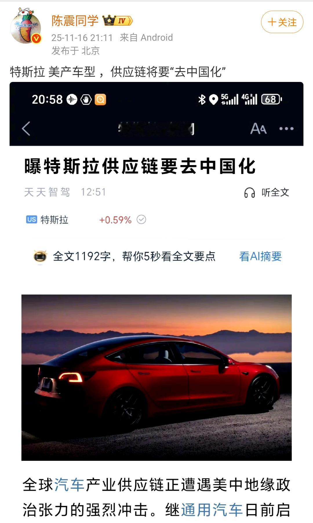 陈震:特斯拉供应链将要“去中国化” ! 这个去中国化指的是在美国生产的特斯拉汽车去中国化,在中国生产的汽车高度依赖中国产业链,所以中国的特斯拉是全球最便宜的。 美国搞的去中国化,大家也都看到了,但是我们和其他国家的经贸往来却大幅度的提高,比如说和欧洲和东南亚和非洲的贸易额都在大幅度上升。 各位是怎么看的?欢迎评论区留言。